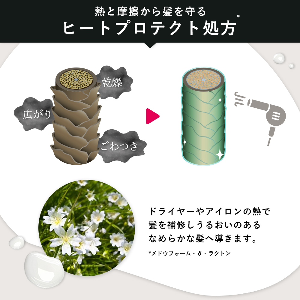 「メドウフォーム‐δ‐ラクトン」を配合したヒートプロテクト処方で、熱の力を味方にケア。さらに「 カチオン化18-MEA誘導体* 」を配合することで、擬似キューティクルを形成して毛髪表面を補修します。乾燥・広がり・ごわつき が気になる髪を、うるおいのあるなめらかな髪へ導きます。(*イソアルキル(C10-40)アミドプロピルエチルジモニウムエトサルフェート)