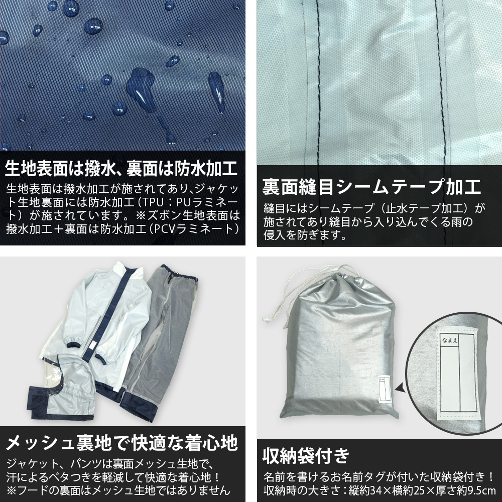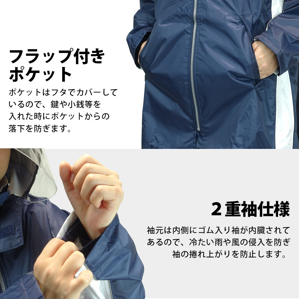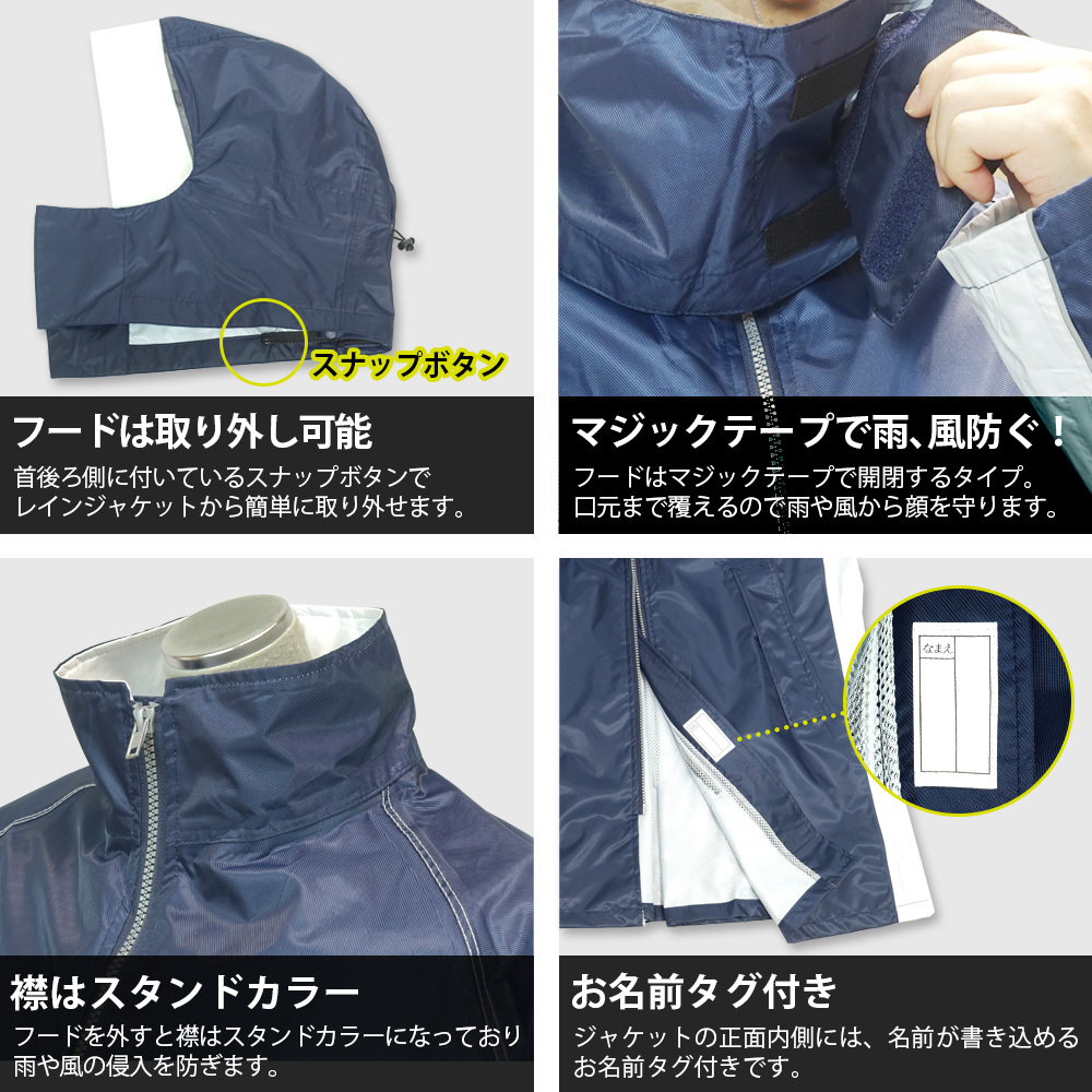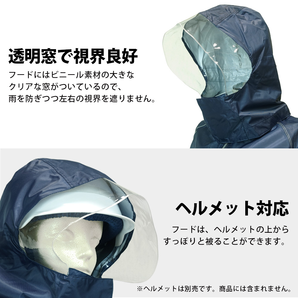 ヘルメットを被りながらフードを着用できるので、小学生、中学生、高校生の学校の自転車での通学用にお勧めです。こちらの商品は学生服の上から羽織れるので、学生用のレインウェアとして特にお勧めです。また、取り外し可能なフードは前が透明になっているので視界を妨げません。