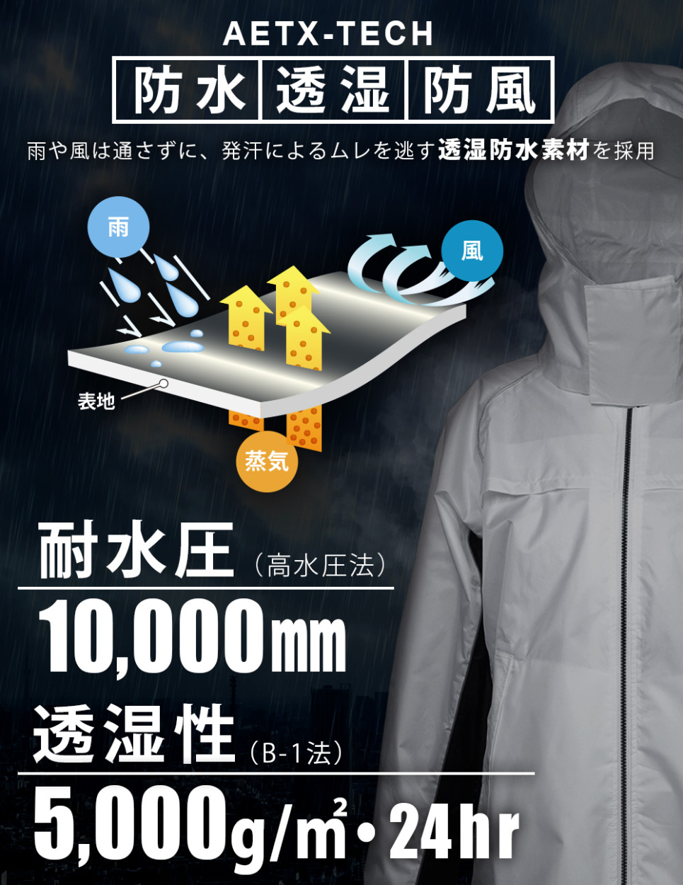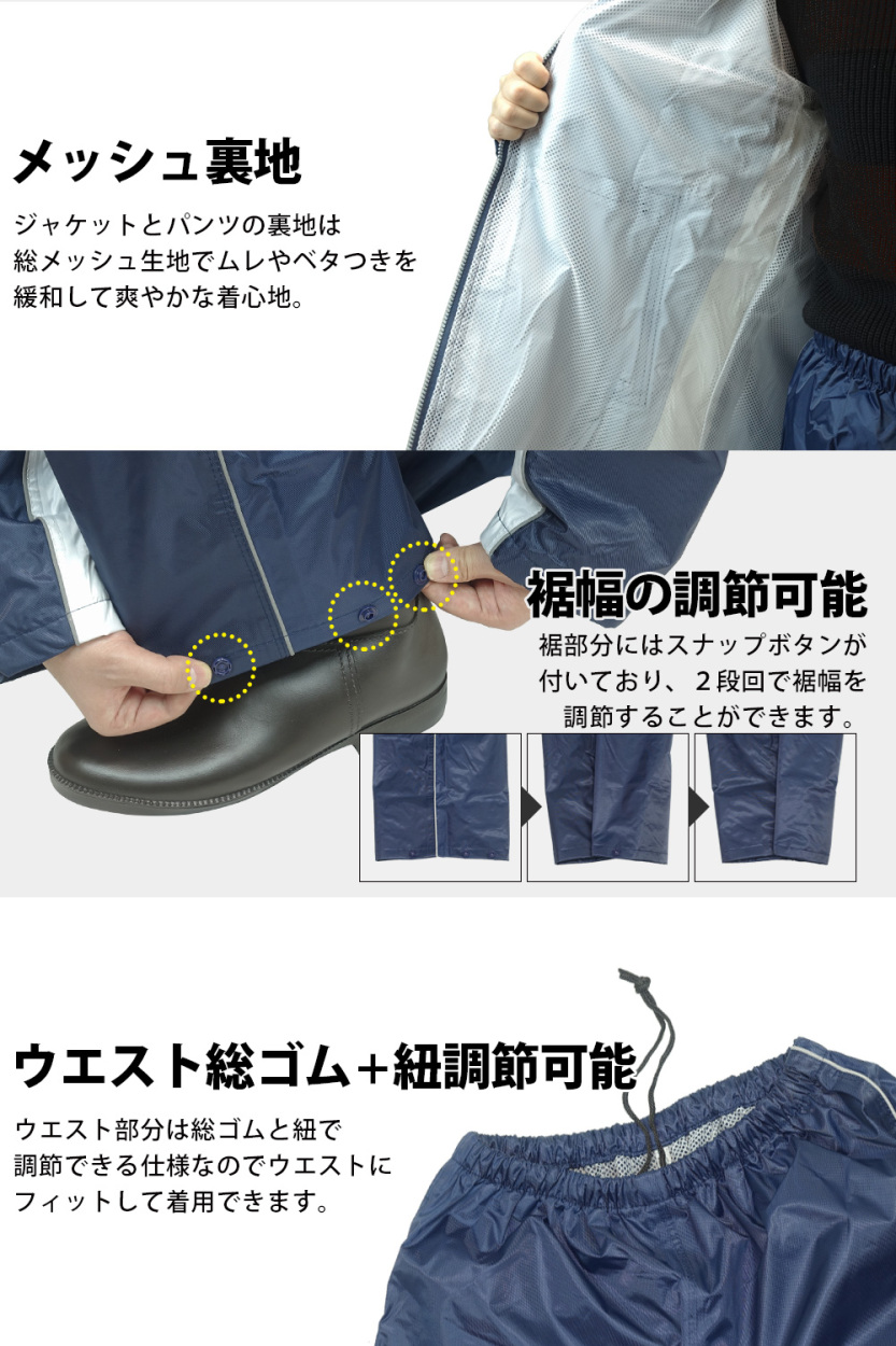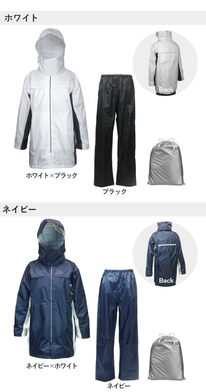 回転フードで左右の確認がしやすい、リュックを背負いながら着用できるヘルメット対応のレインウェアの上下セットです。
