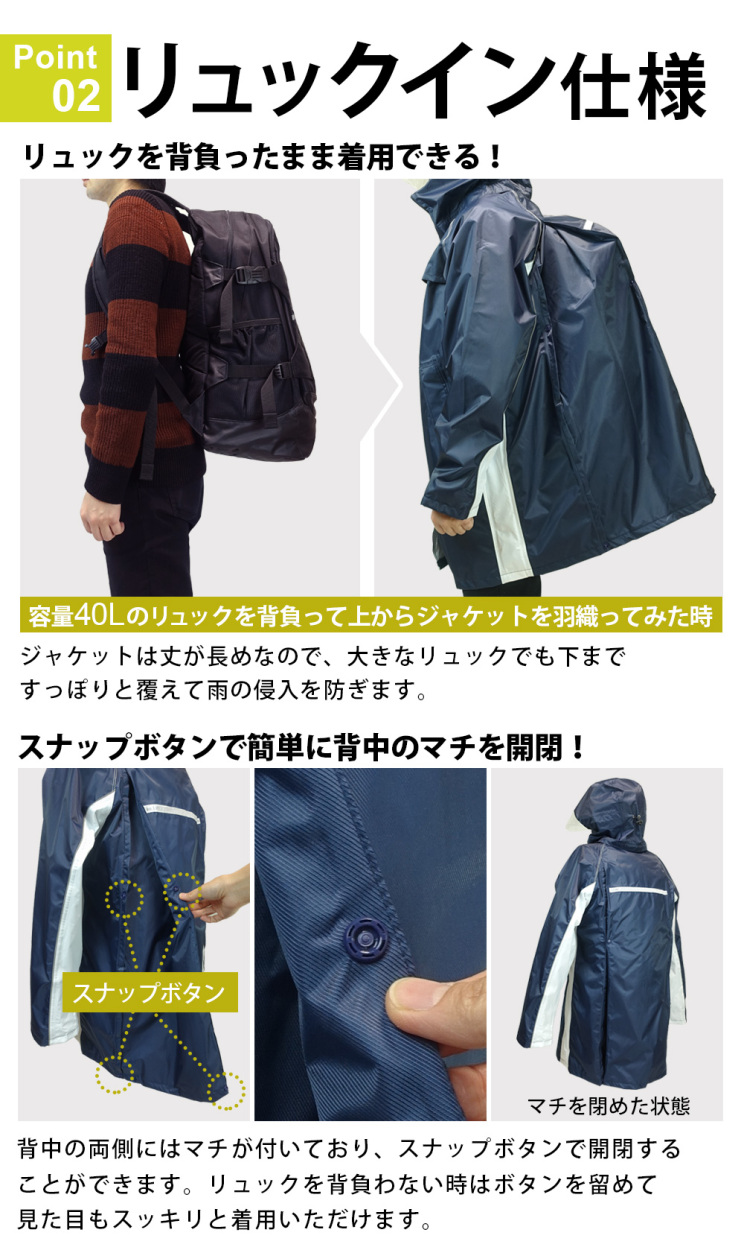 背中にはスナップボタンで広げられるマチがついており、リュックサックを背負いながら着用することができます。丈が長めの作りになっているので、大きなリュックでも下までスッポリと覆えて雨の侵入を防ぐことができます。