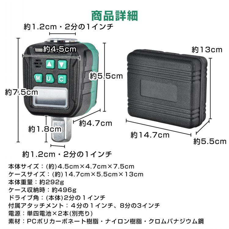 | 種類・サイズ | ・本体サイズ:(約)4.5cm×4.7cm×7.5cm ・ケースサイズ:(約)14.7cm×5.5cm×13cm ・本体ドライブ角:(オスメス)1/2インチ ・付属アタッチメント:1/4インチ、3/8インチ |