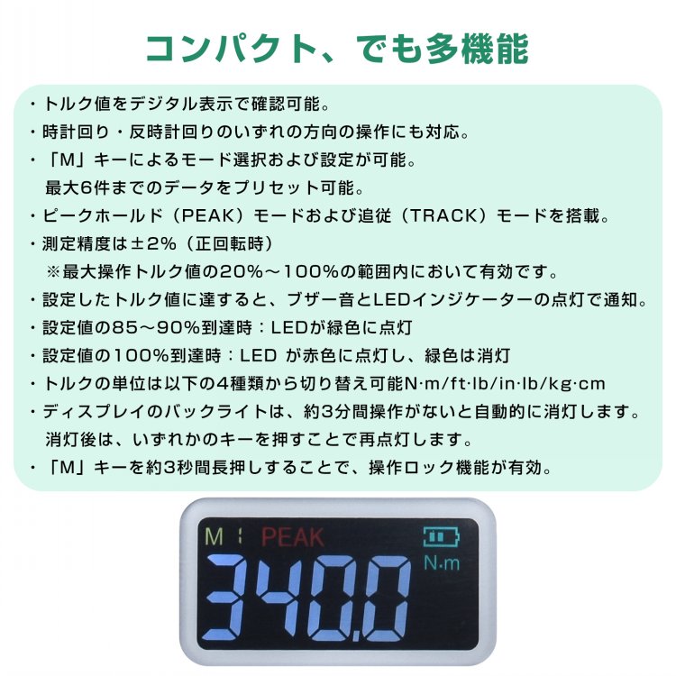 1/2インチ 1/4インチ 3/8インチ プリセット機能 ドライブ 単位切り替え 単位4種類 ディスプレイ ロック機能 ディスプレイ ブザー エンジン カスタムバイク メンテナンス 製造業 トルク管理 品質管理 トルク測定 研究開発 電動ドライバー ねじ 締め付け管理 高精度 トルクメーター ピークトルク メーター 記録機能 敬老の日 父の日 母の日 クリスマス プレゼント ギフト