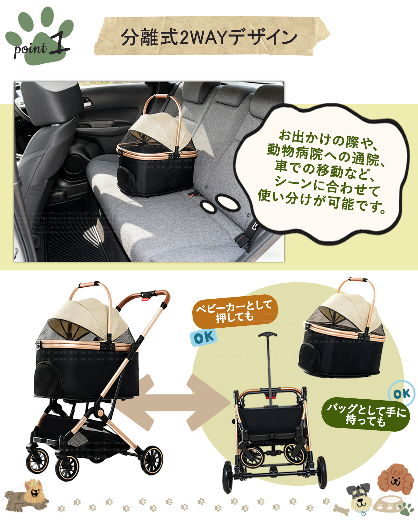 内部はゆったり設計でペットがくつろぎやすく、クッションを敷けばさらに快適。分離型キャリーとして単体利用も可能で、動物病院や電車移動にも対応。