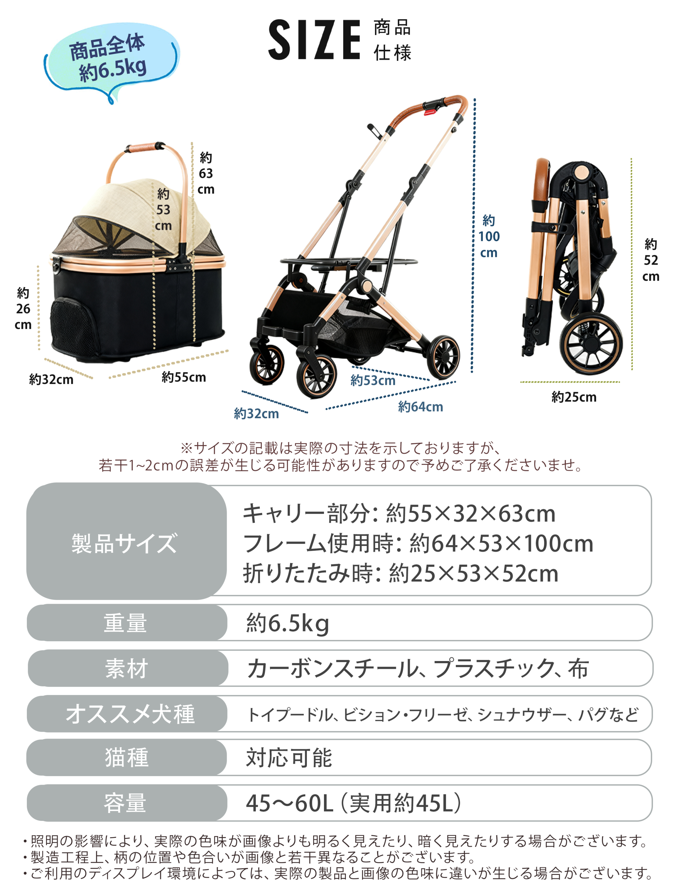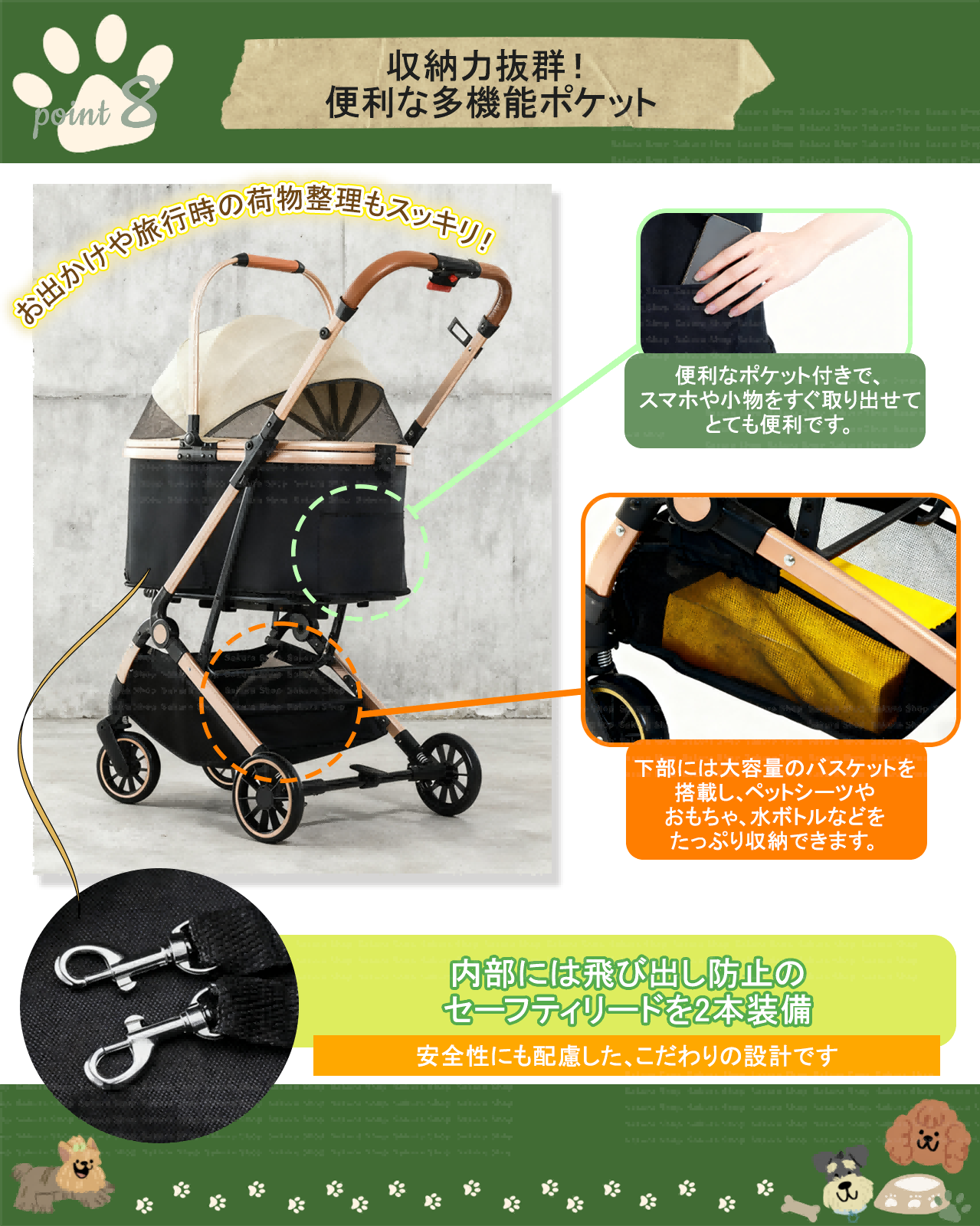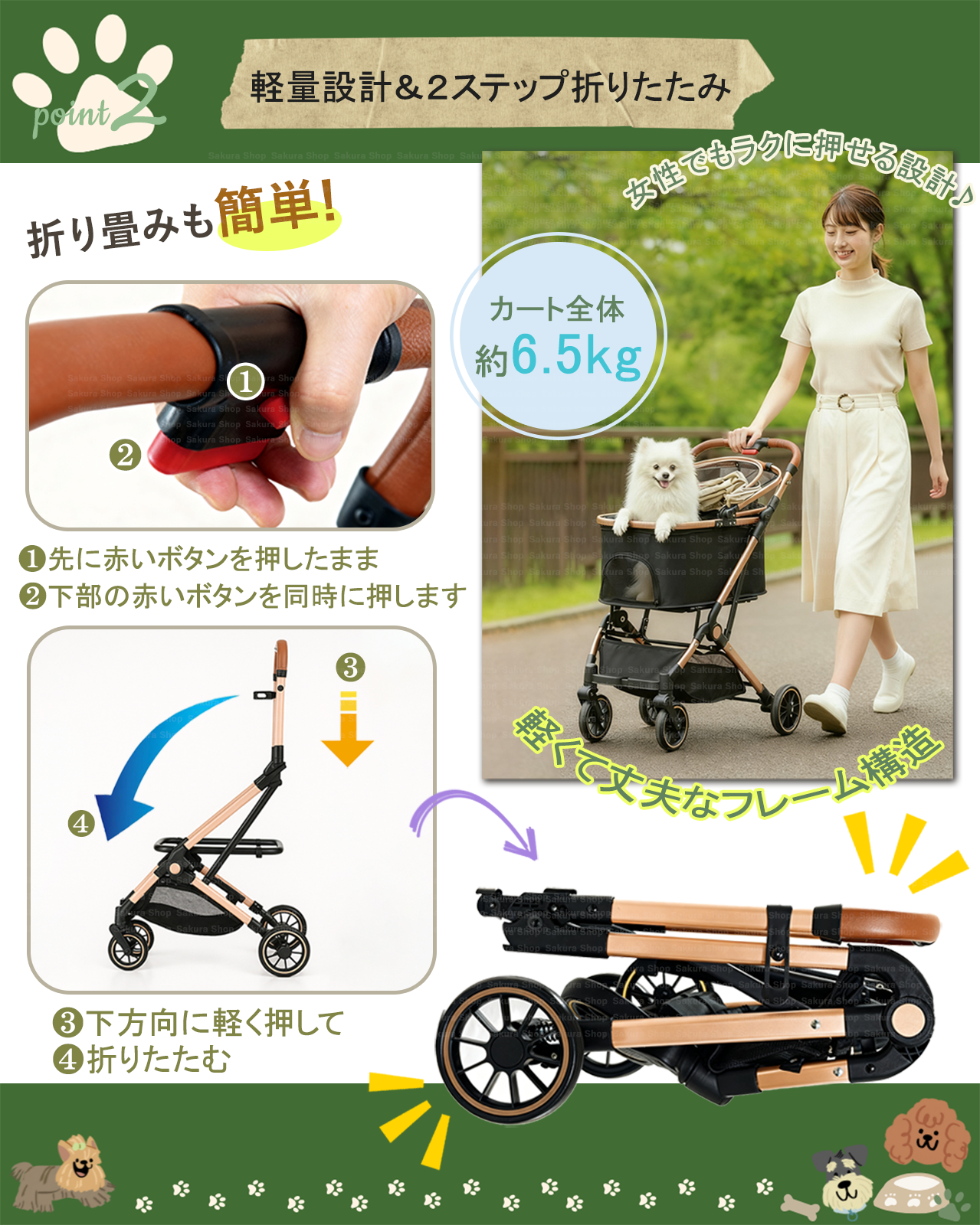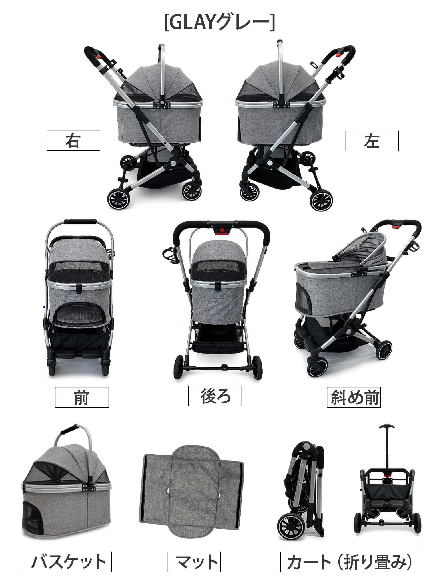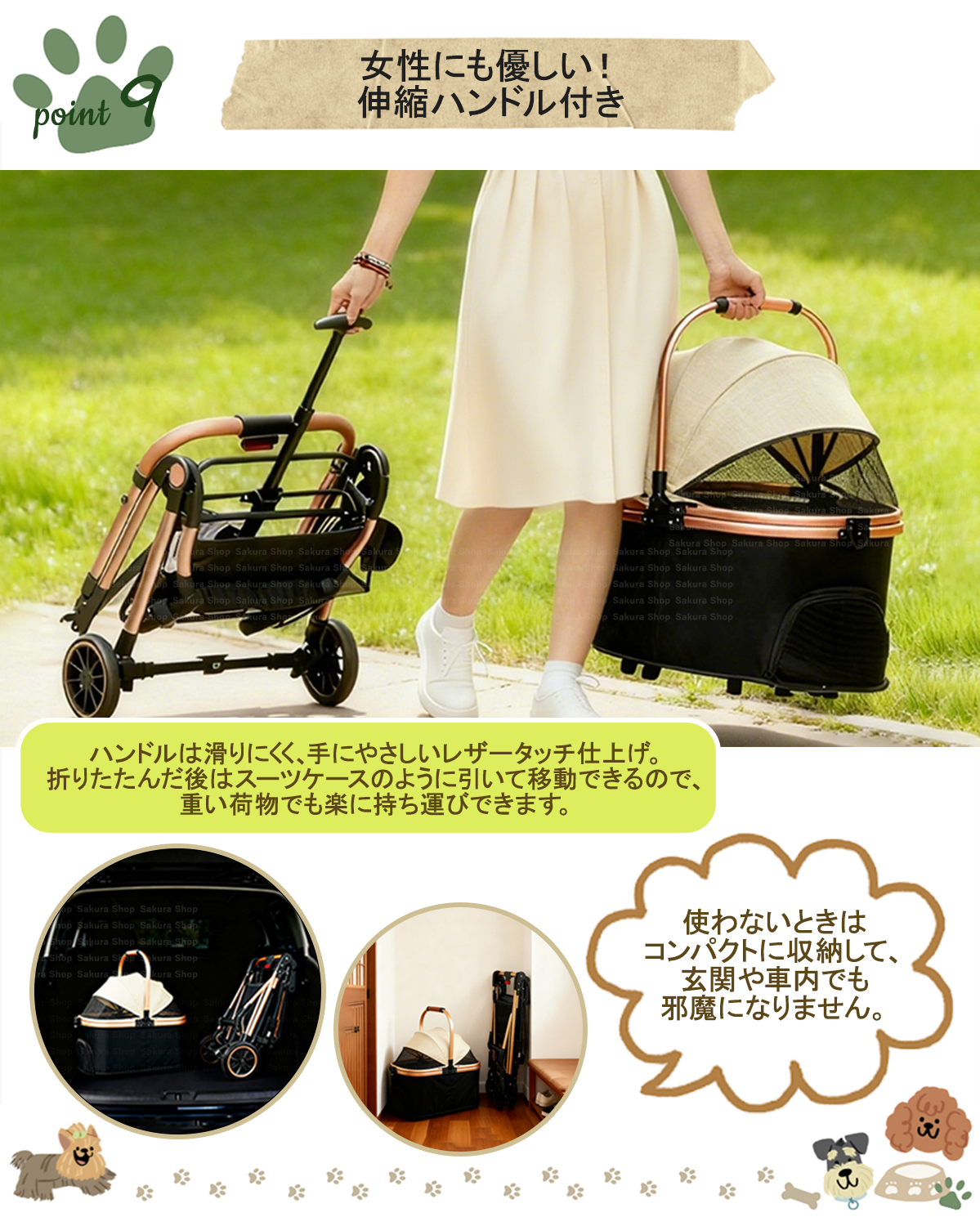 コンパクトに折りたためるので、車のトランクや玄関収納にもラクラク収まります。さらに大容量のバスケット付きで、ペット用品やお出かけグッズもまとめて収納でき、両手が自由になるのも嬉しいポイント。