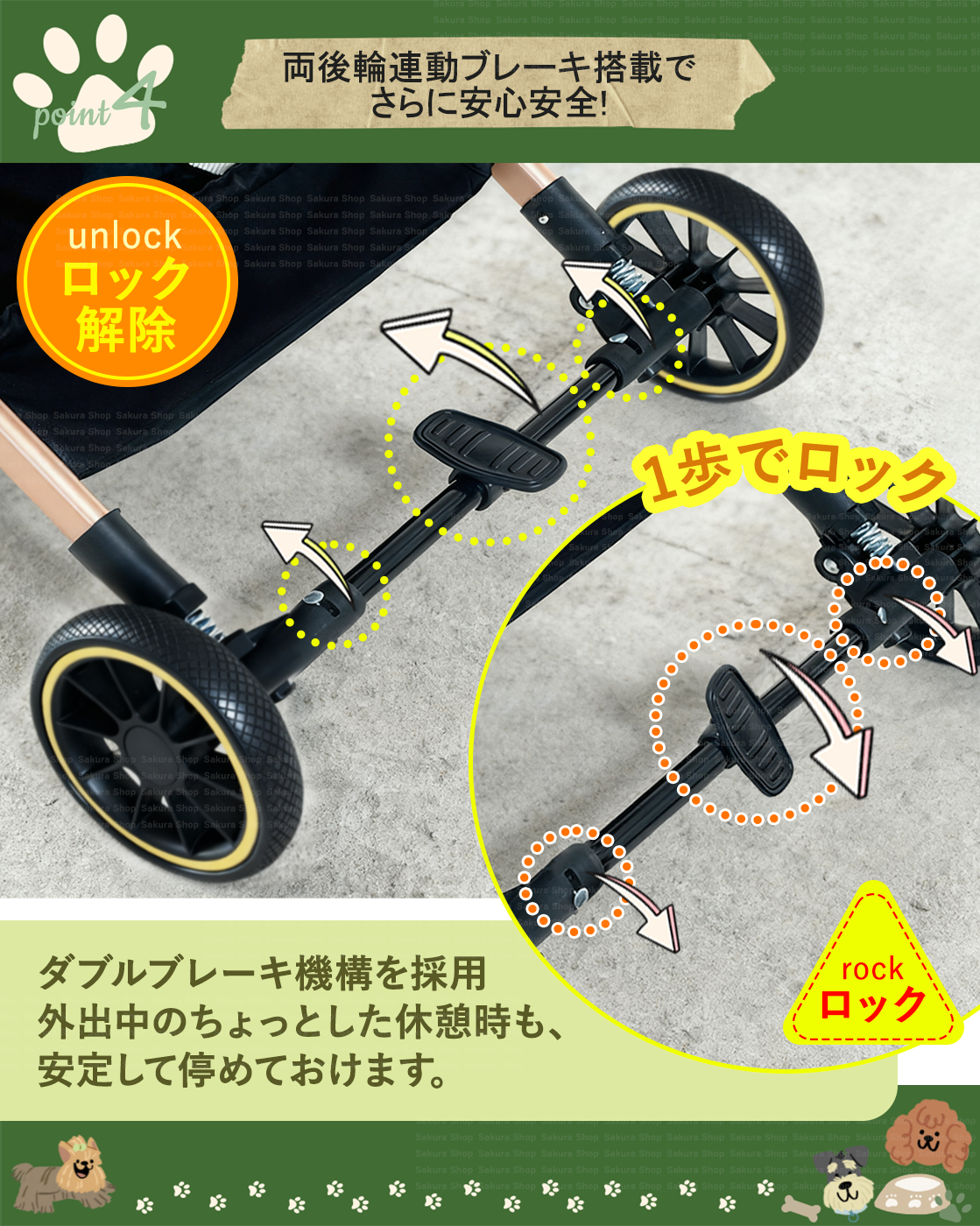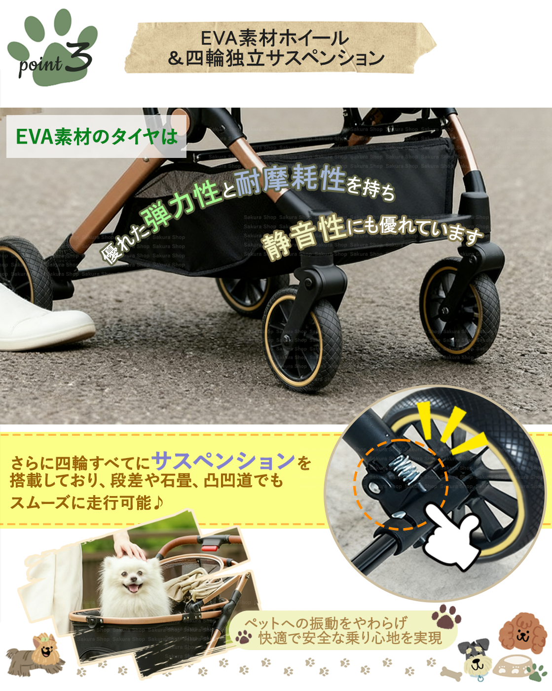 走行性に優れた4輪構造で、前輪は360°回転可能。狭い道でもスムーズに操作できます。後輪はストッパー付きで安全性も高く、坂道や停車時も安心です。静音タイヤを採用しているため、夜のお散歩や室内移動でも音が気になりません。