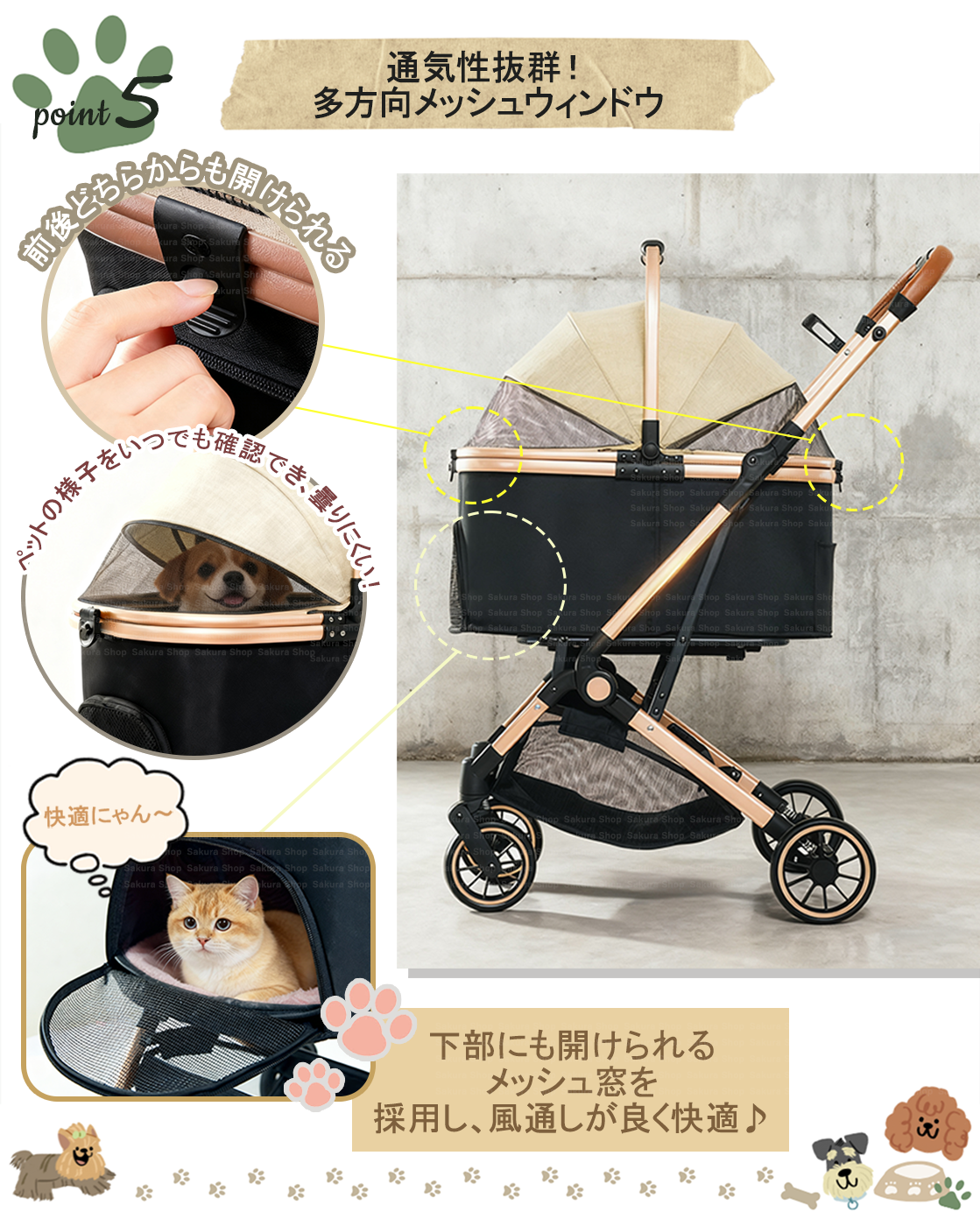 対面式&フルオープン仕様で、ペットとコミュニケーションをとりながら移動可能。上部はメッシュ素材で通気性が良く、真夏でも蒸れにくく快適。