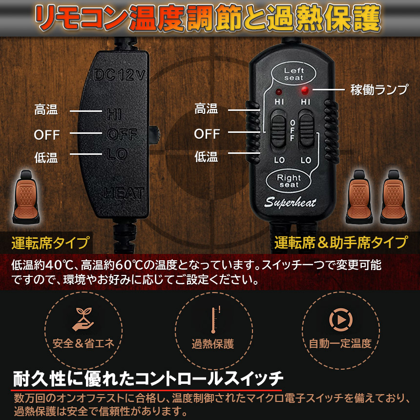高温/低温/オフの温度切り替え機能付き、素早く安定した加熱で、過熱保護機能も搭載。コントローラーもシンプル設計なので迷うことはありません。暖房だと温風が出るまでと、車全体を温めるため時間が掛かりますが、スイッチ1つですぐぽかぽか!