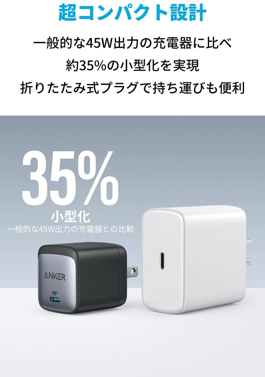 ・超コンパクト設計:一般的な45W出力の充電器に比べ約35%小さなコンパクトサイズを実現。折り畳み式プラグを採用し、カバンやポケットにスムーズに収納し、どこにでも気軽に持ち運ぶことができます。