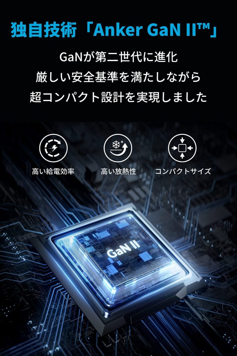 約2年の研究開発を経てGaN(窒化ガリウム)搭載USB充電器が第二世代に進化。電源ICと回路設計に革新を起こしGaNの持つ素材の力をさらに引き出したAnkerの独自技術です。スイッチング周波数を高めて電子部品を省サイズ化するとともに、高周波化の弊害として発生する熱およびEMI(ノイズ)を、内部基板部品の立体配置と回路構造の最適化(PCBA 3D スタッキング)で抑えました。結果として、厳しい安全基準を満たしながらさらなる小型化に成功しました。