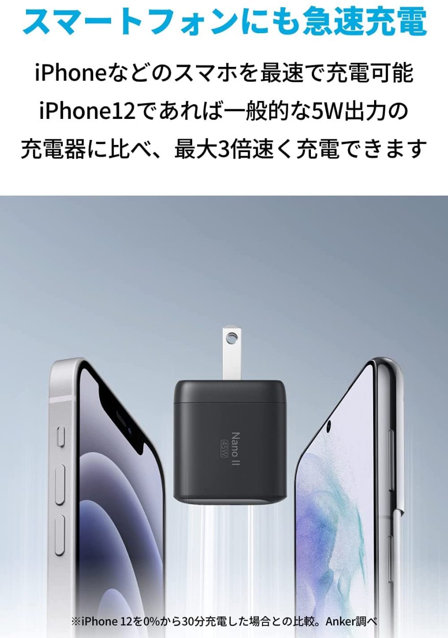 ・パッケージ内容:Anker Nano II 45W、取扱説明書、最大24ヶ月保証 (※正規販売店からの注文に限り18ヶ月保証の対象となり、条件付きで+6ヶ月の延長保証が付きます。注文番号が保証書の代わりとなります。)、カスタマーサポート
