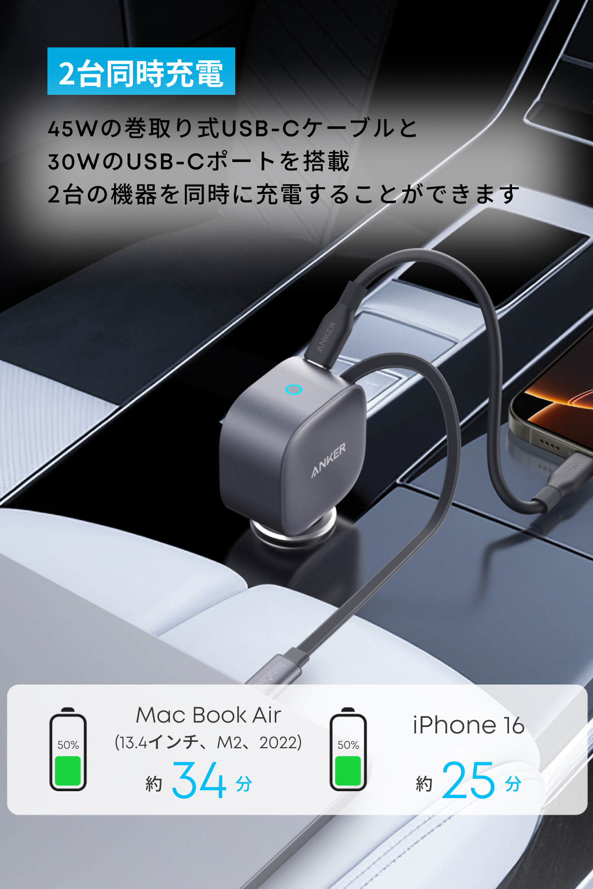 USB PD対応の45Wの巻き取り式USB-Cケーブルと30WのUSB-Cポートを搭載。合計最大75W出力で、お使いの機器へ2台同時に充電することができます。