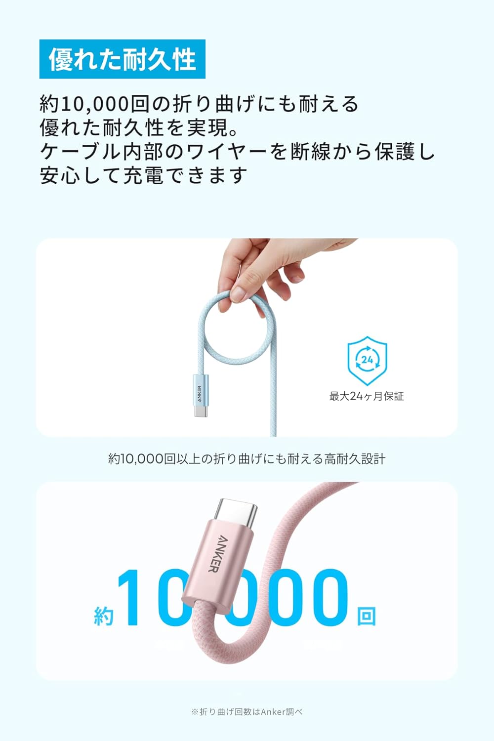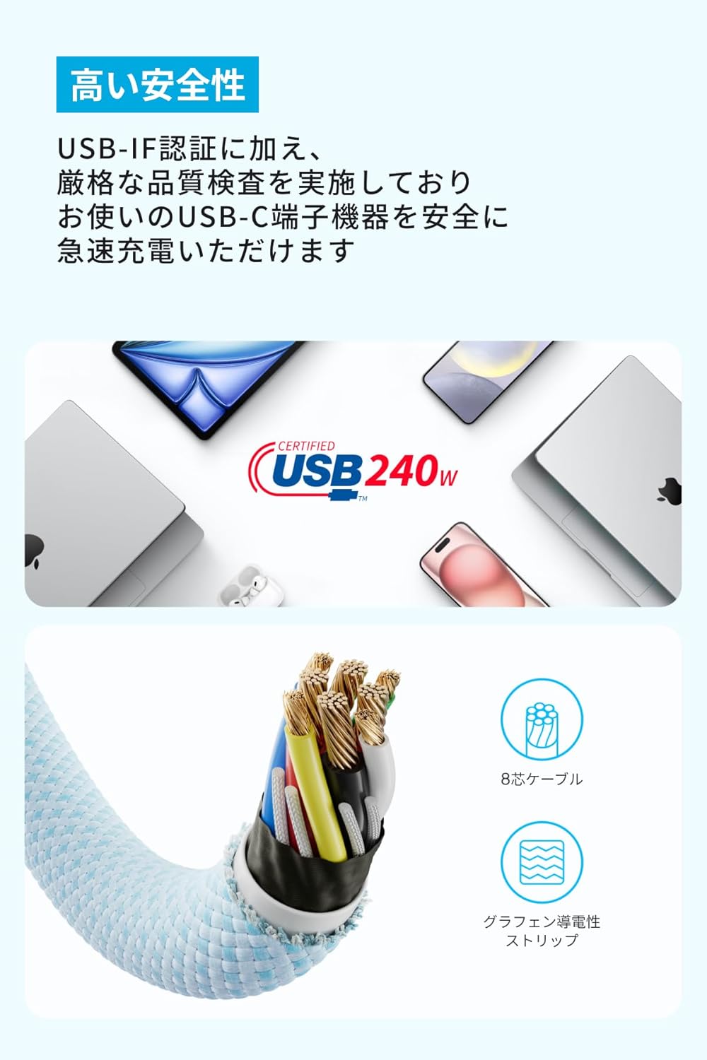 | パッケージ内容 | Anker Zolo USB-C & USB-C ケーブル (240W)、結束バンド、カスタマーサポート |