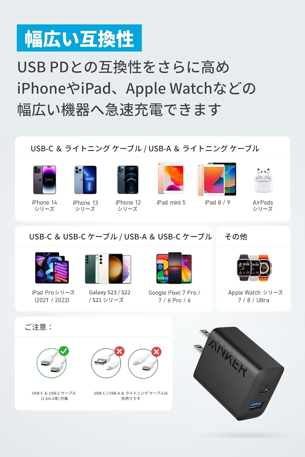Anker Charger (20W, 2-Port) x 2個、USB-C&USB-Cケーブル (1.5m)x 2個 、取扱説明書、MAX24ヶ月保証 、カスタマーサポート