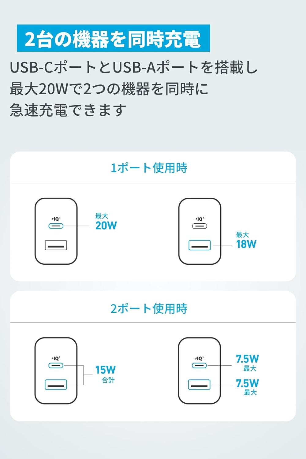 最大20W出力で、iPhoneを含むスマートフォンへの充電に最適です。