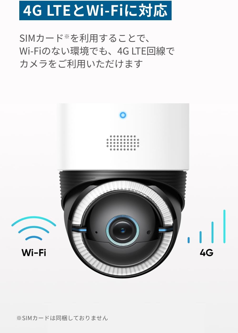 SIMカード※を利用することで、 Wi-Fiのない環境でも、4G LTE回線で カメラをご利用いただけます。 ※SIMカードは同梱しておりません