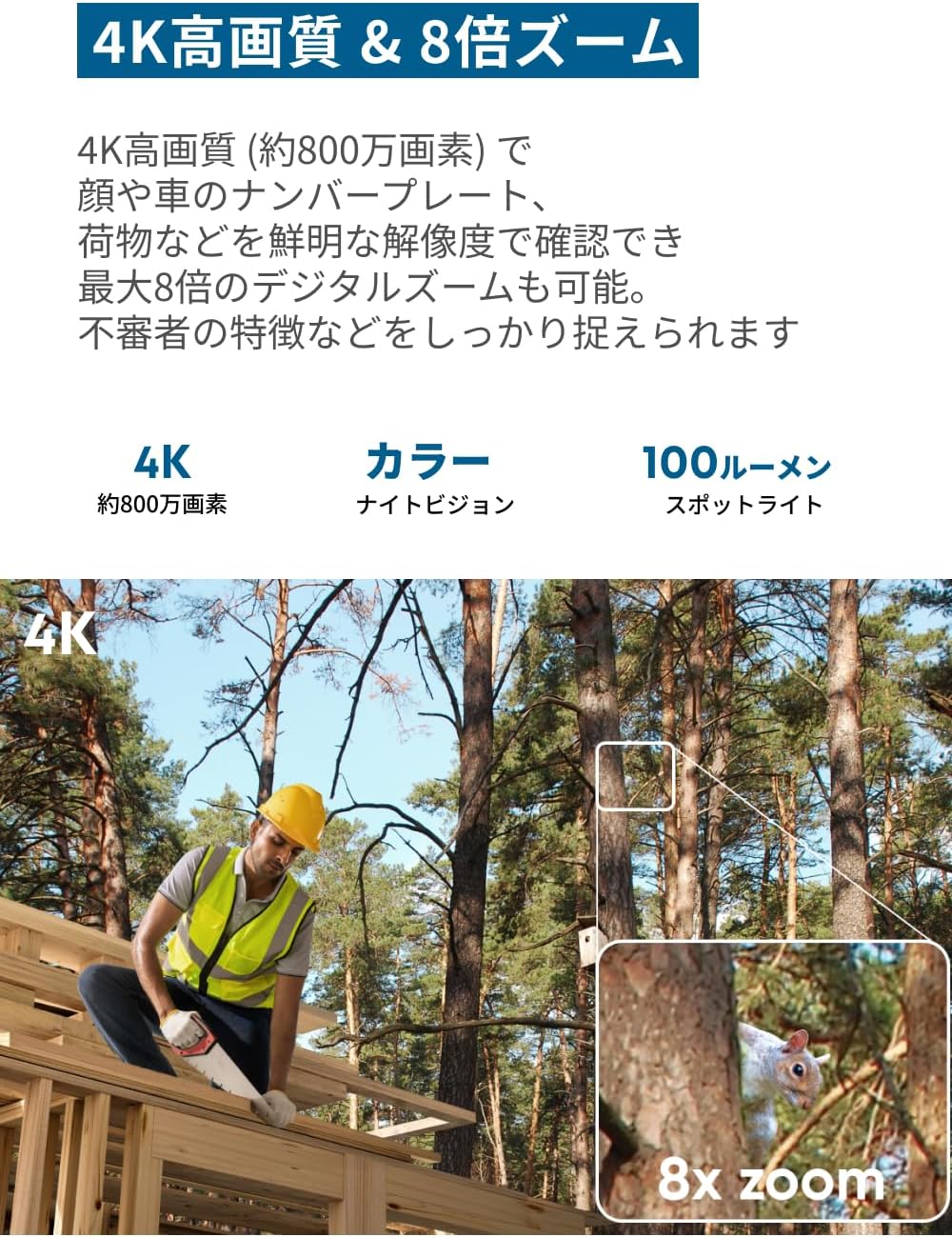 4K高画質 (約800万画素) で顔や車のナンバープレート、荷物などを鮮明な解像度で確認でき、 最大8倍のデジタルズームも可能。不審者の特徴などをしっかり捉えられます。