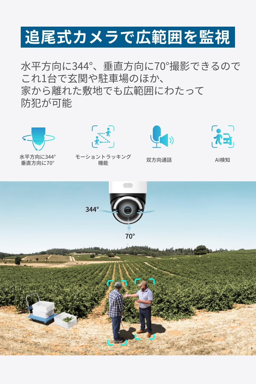 水平方向に344°、垂直方向に70°撮影できるのでこれ1台で玄関や駐車場のほか、家から離れた敷地でも広範囲にわたって防犯が可能。