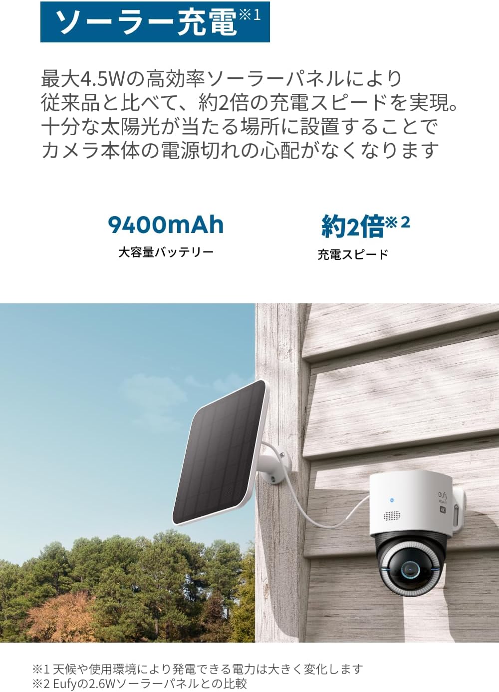 ※1 天候や使用環境により発電できる電力は大きく変化します ※2 Eufyの2.6Wソーラーパネルとの比較