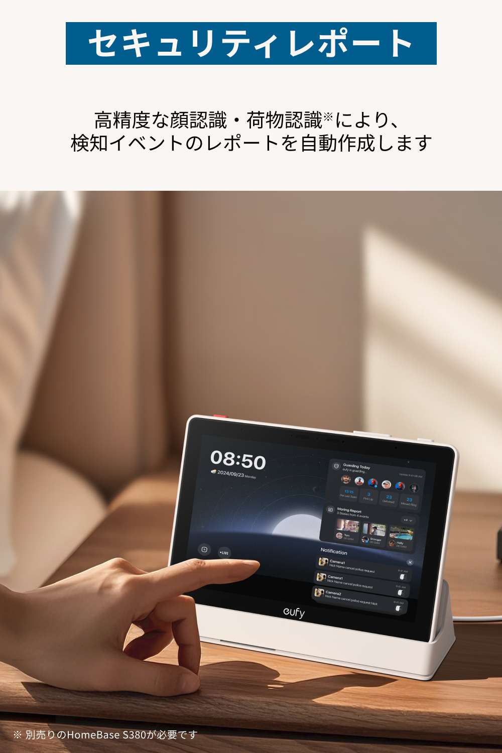 8インチの大画面で、Eufyセキュリティカメラからのライブ映像を最大4つまで表示可能。スマホがなくてもカメラ映像を確認できます。