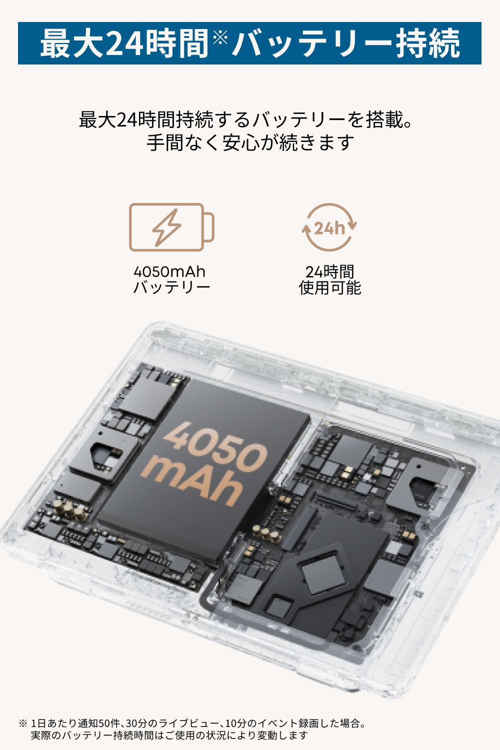 最大24時間持続するバッテリーを搭載。手間なく安心が続きます。