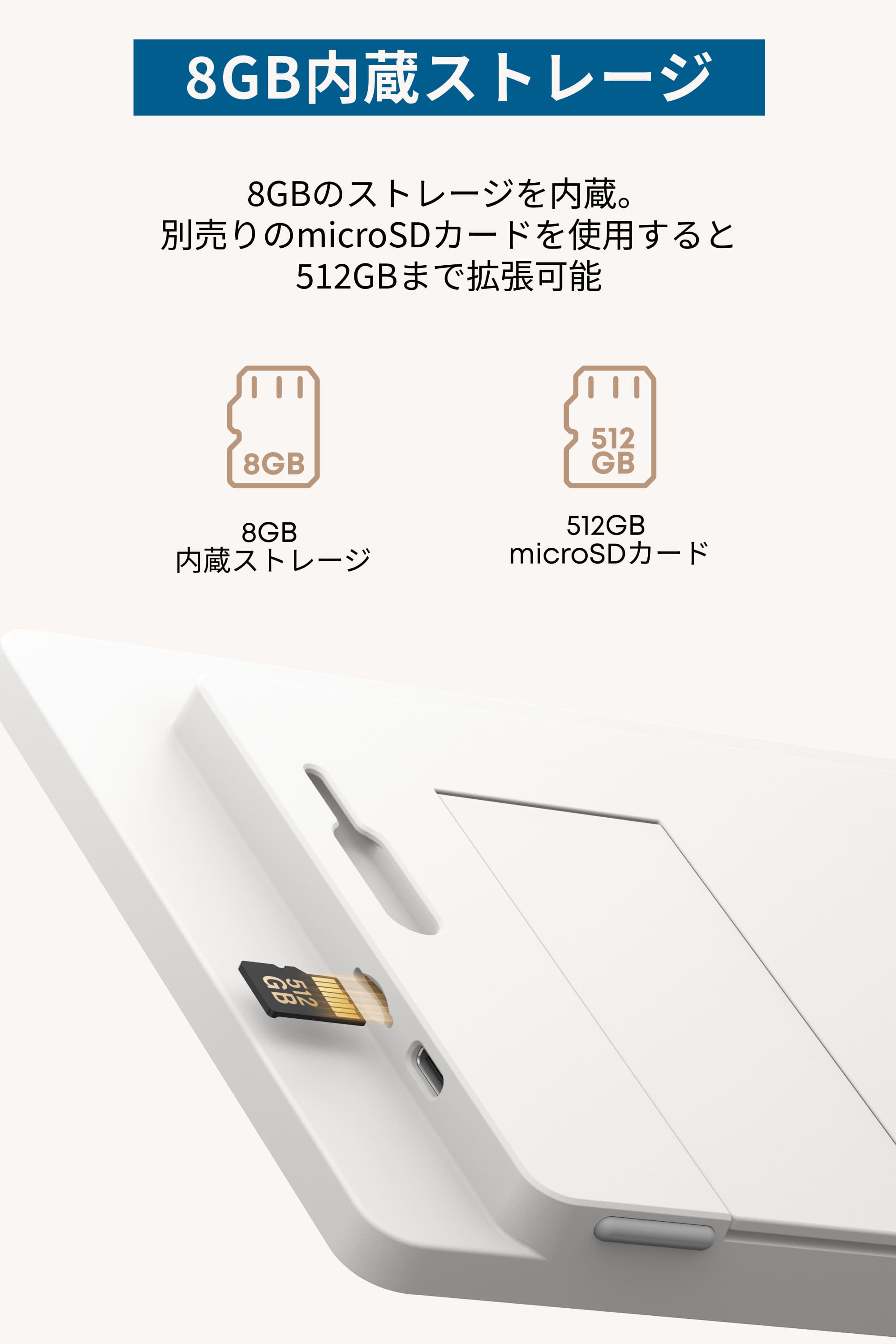 8GBのストレージを内蔵。別売りのmicroSDカードを購入すると512GBまで拡張可能。大容量で必要な録画データを保存することができます。