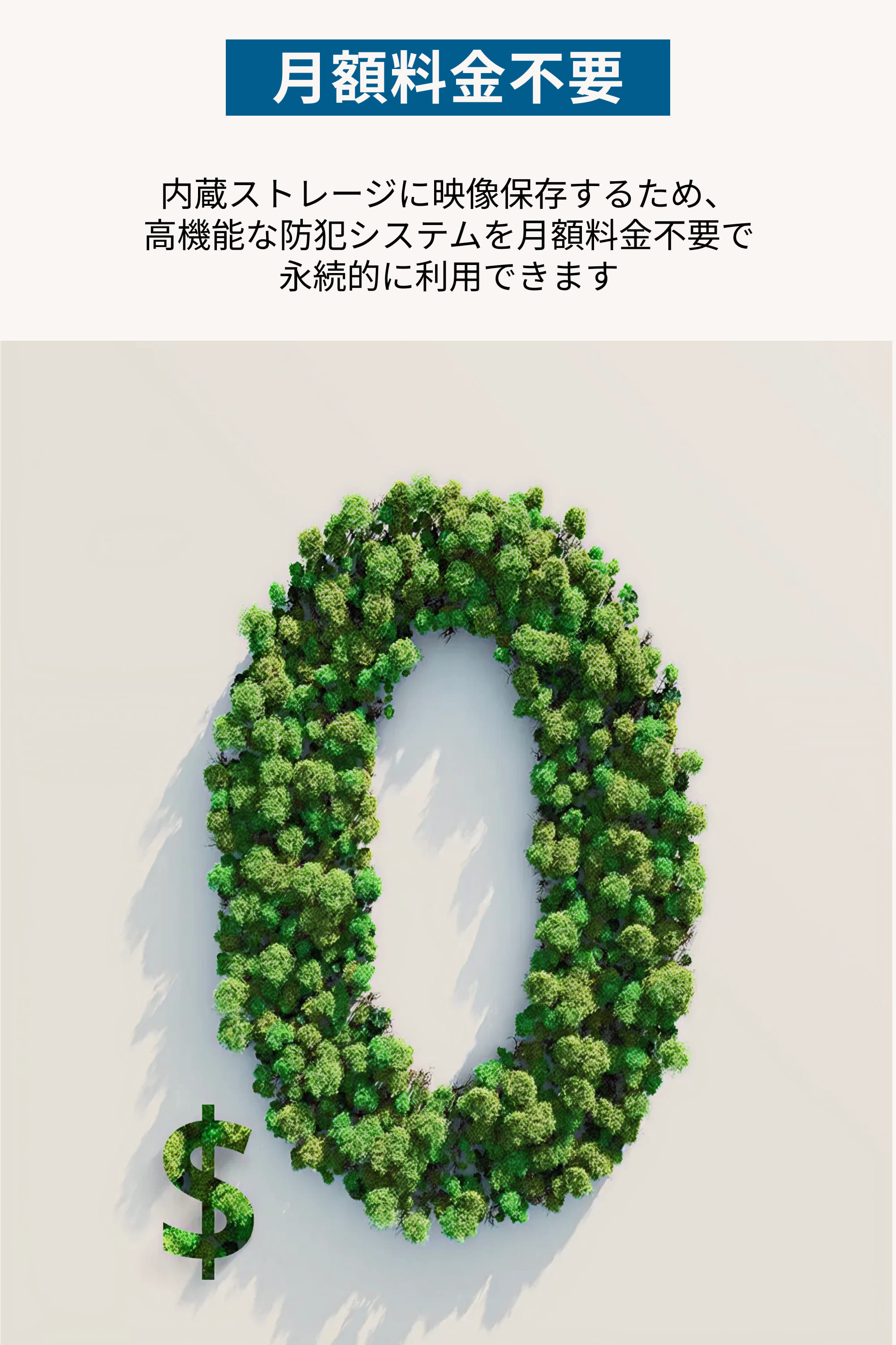 内蔵ストレージに映像保存するため、高機能な防犯システムを月額料金不要で永続的に利用できます。
