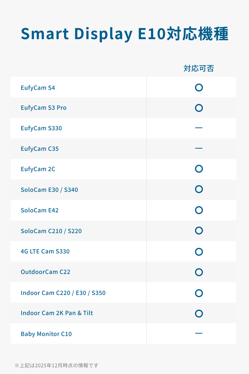 Eufy Smart Display E10は、Eufy以外の防犯カメラとの互換性はサポートしておらず、Eufy製品のみ対応となります。