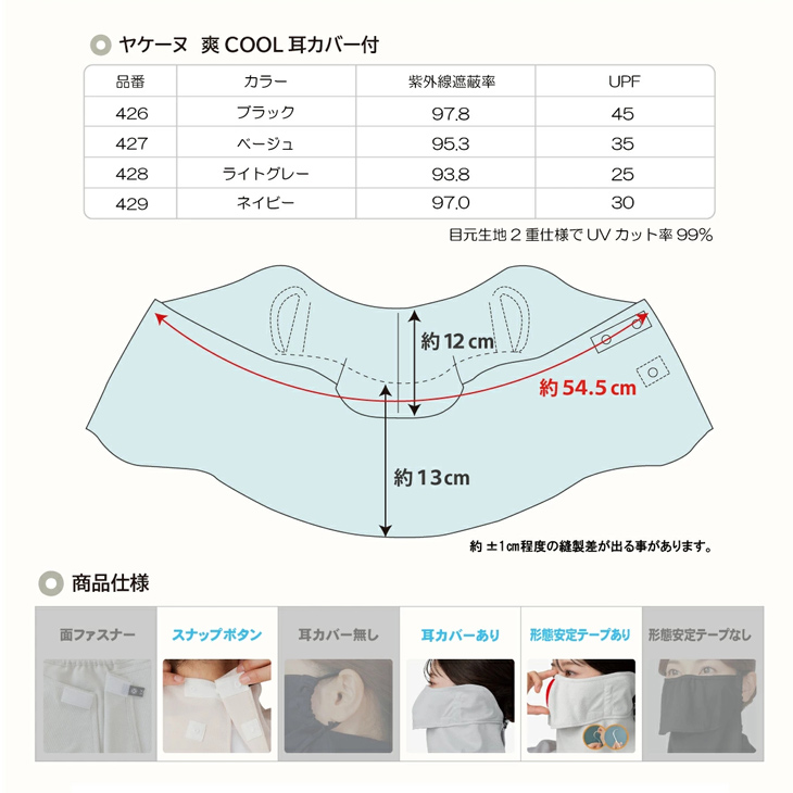 ヤケーヌフェイスカバーは、お顔の紫外線対策、日焼け予防を目的としたフェイスマスク。