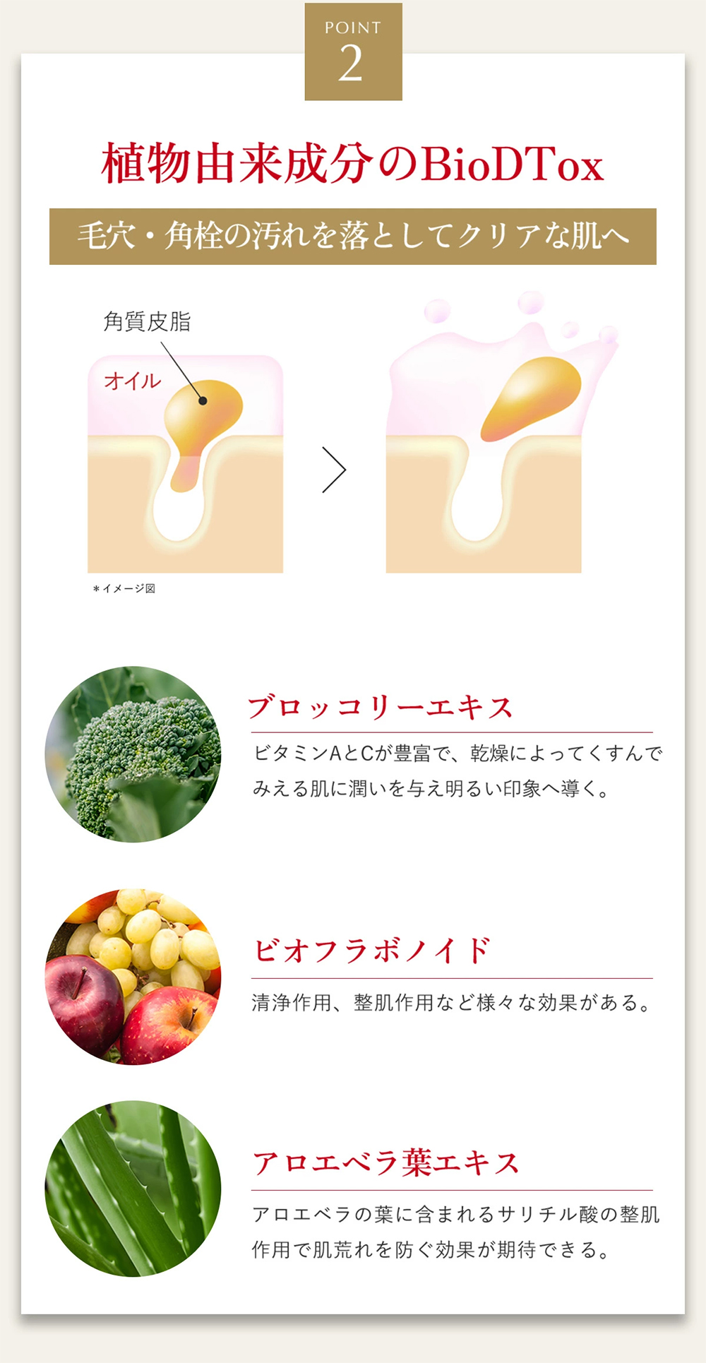 オイル成分が肌表面の古い角質や汚れにアプローチ。肌に必要な潤いを守りながら、不要な汚れをさっぱりと拭き取り、キメの整った滑らかな素肌へと導きます。