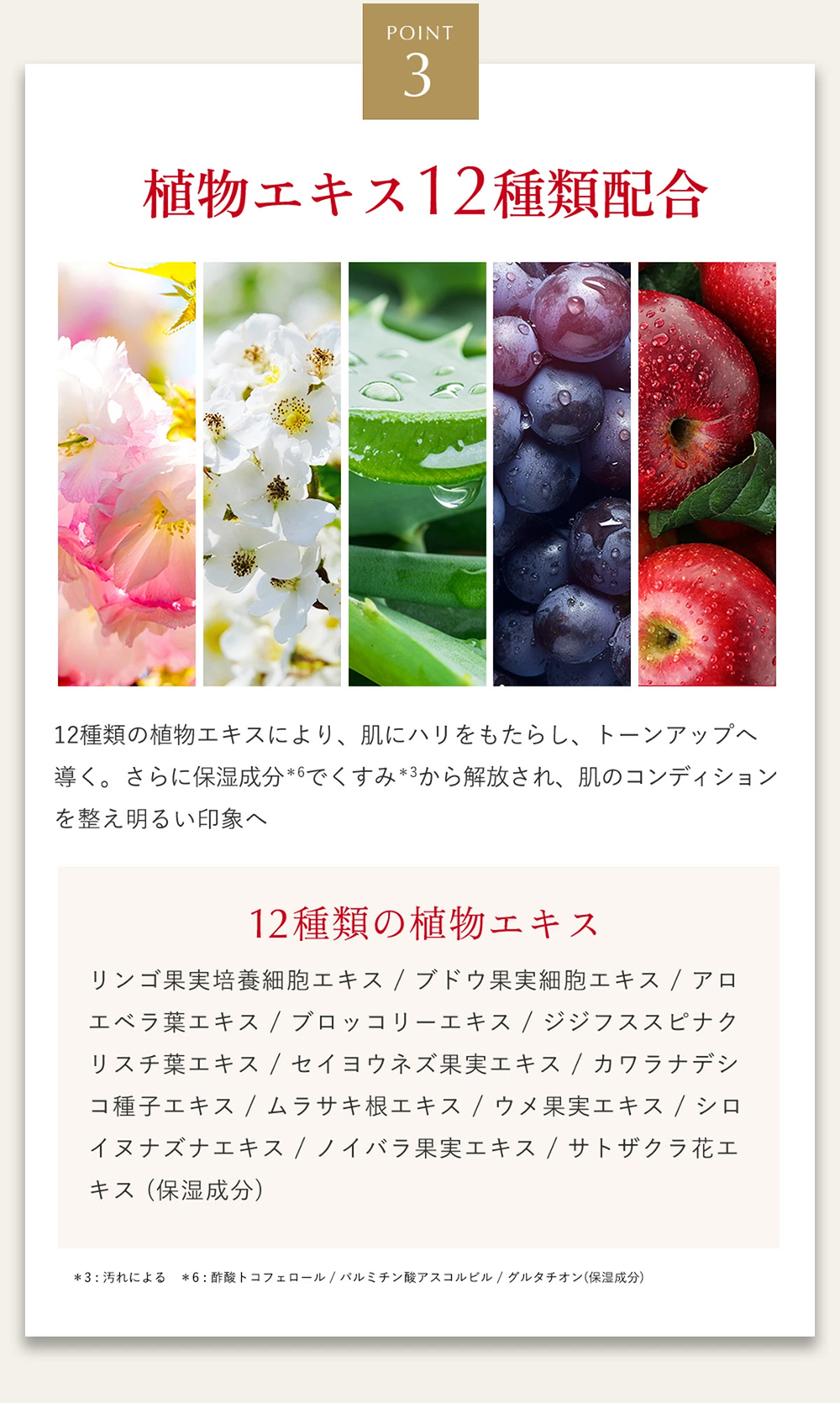 | 水、炭酸ジカプリリル、セバシン酸ジエチルヘキシル、PPG-9ジグリセリル、スクワラン、BG、リンゴ果実培養細胞エキス、ブドウ果実細胞エキス、アロエベラ葉エキス、ビオフラボノイド、ブロッコリーエキス、トコフェロール、パルミチン酸アスコルビル、グルタチオン、ジジフススピナクリスチ葉エキス、セイヨウネズ果実エキス、カワラナデシコ種子エキス、ペンチレングリコール、ジフェニルシロキシフェニルトリメチコン、シクロヘキサン-1,4-ジカルボン酸ビスエトキシジグリコール、1,2-ヘキサンジオール、カプリリルグリコール、クエン酸Na、塩化Na、クエン酸、ムラサキ根エキス、プロパンジオール、パパイン、トレハロース、乳酸桿菌/セイヨウナシ果汁発酵液、グリセリン、レシチン、ウメ果実エキス、アルブチン、シロイヌナズナエキス、ノイバラ果実エキス、アマニ脂肪酸、酢酸トコフェロール、サトザクラ花エキス、エチルヘキシルグリセリン、香料、フェノキシエタノール |