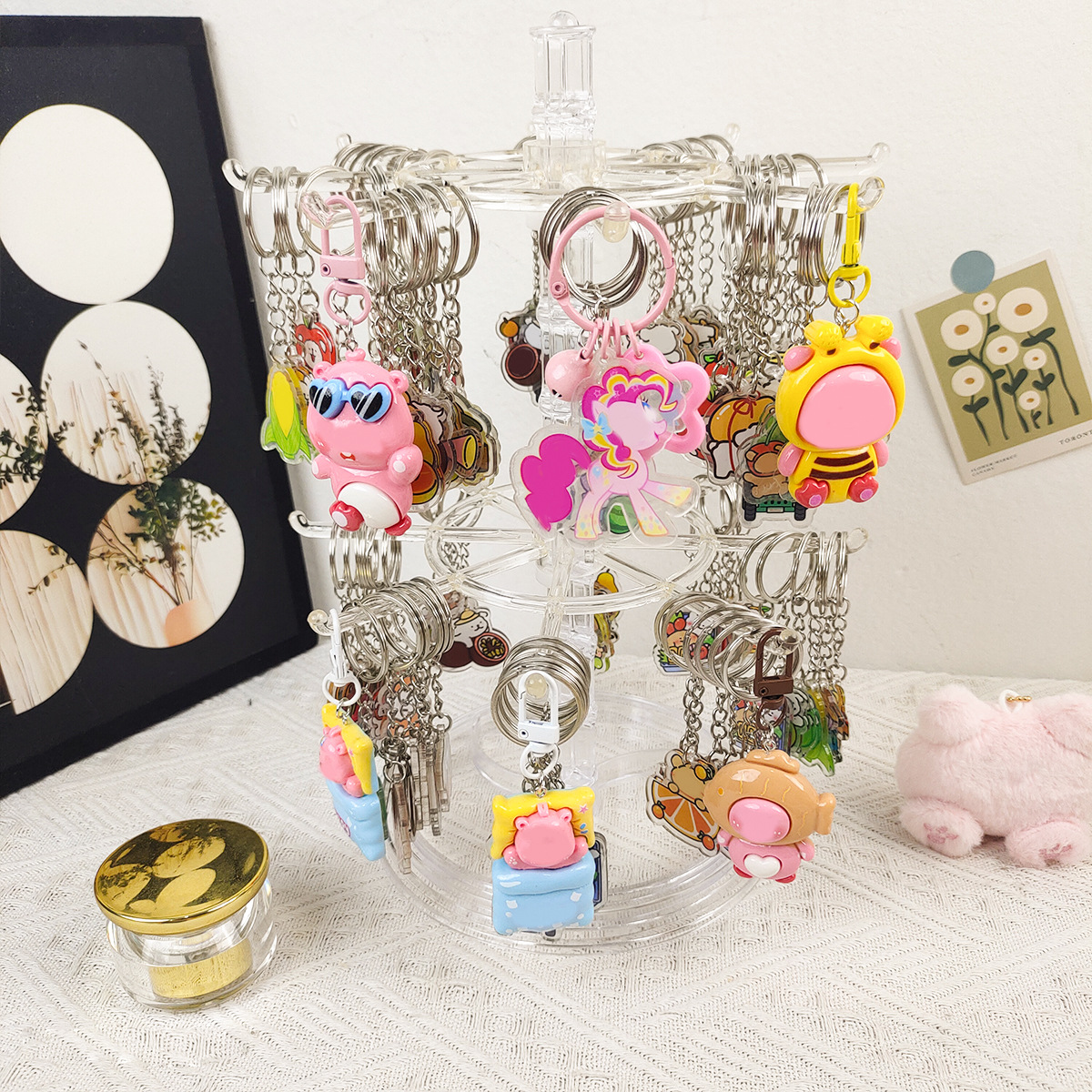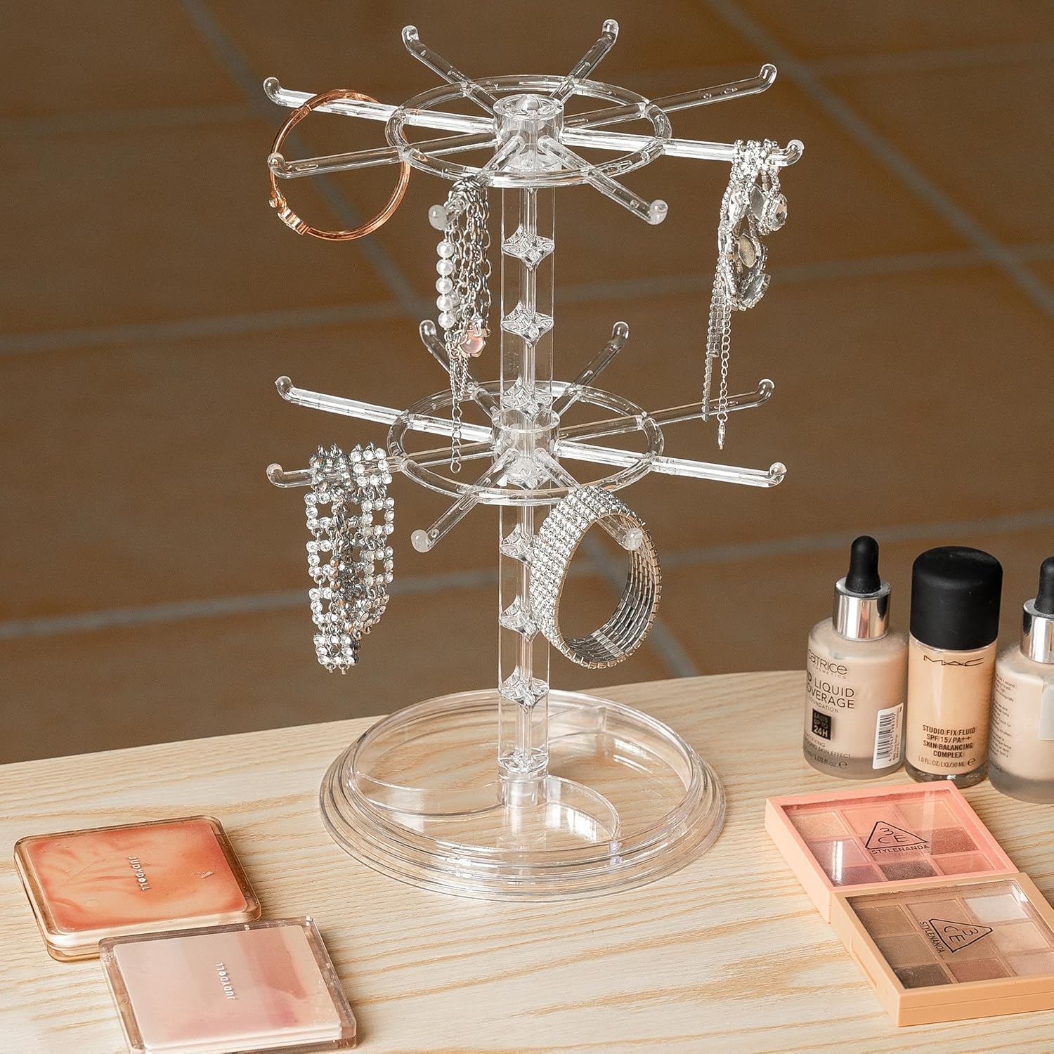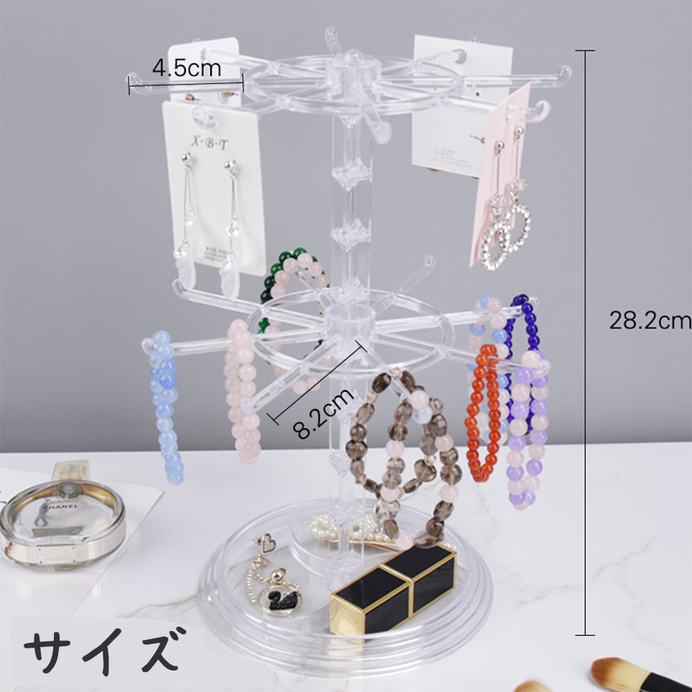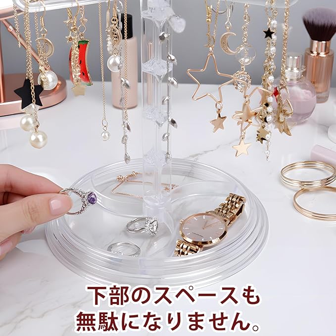 【回転式で取り出しやすい】360度回転する2段のアクセサリースタンド は、推しのキーホルダーやぬいぐるみのほか、ネックレスやブレスレットなどのアクセサリーを収納し、一目で確認できます。