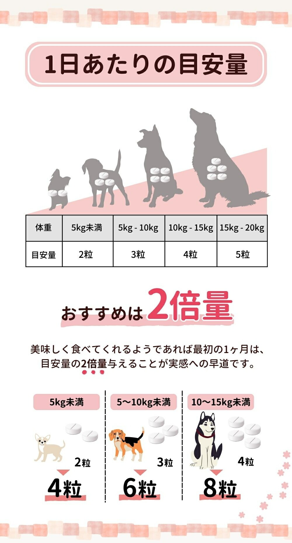 | お召し上がり方 | 成犬体重5kgあたりに 1日2粒程度を与えてください。 |