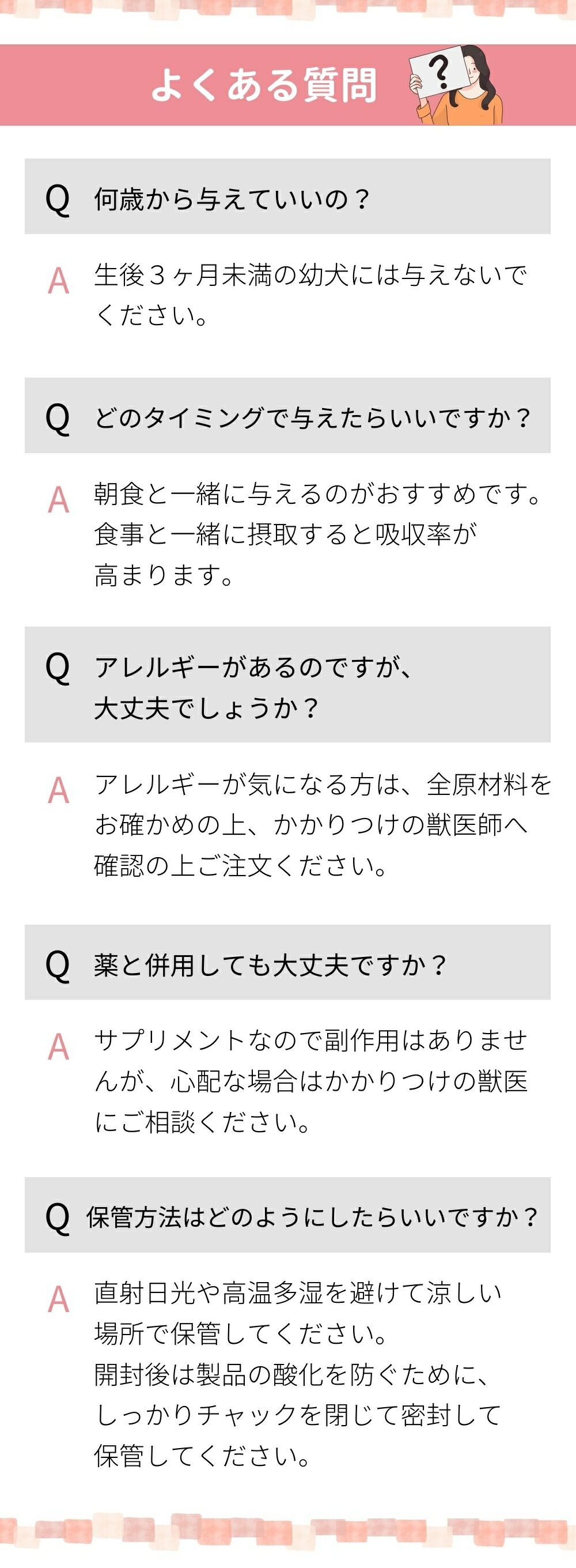 | ご注意 | ・生後3か月未満の幼犬には与えないでください。 ・体調に応じて分量は調整してください。 ※成分によりまれに体質に合わない場合があります。 その際はご使用を中止し、かかりつけの獣医師へご相談ください。 ・食物アレルギーのあるわんちゃんは、原材料をご確認の上ご使用ください。 ・妊娠中、通院中、お薬を服用している場合などは、獣医師へご相談の上ご使用ください。 ・原材料の特性上、色調等が異なる場合がありますが、品質には問題ありません。 |