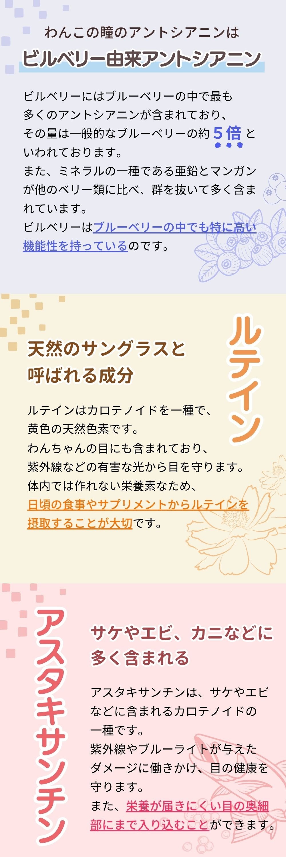 【将来を見渡す3大成分で健康維持! 】輝く笑顔の健康成分「アントシアニン」や鮮やかな毎日に「アスタキサンチン」、まぶしさケアの「ルテイン」の3大成分を配合した愛犬用に作られた目のケアサプリメント。