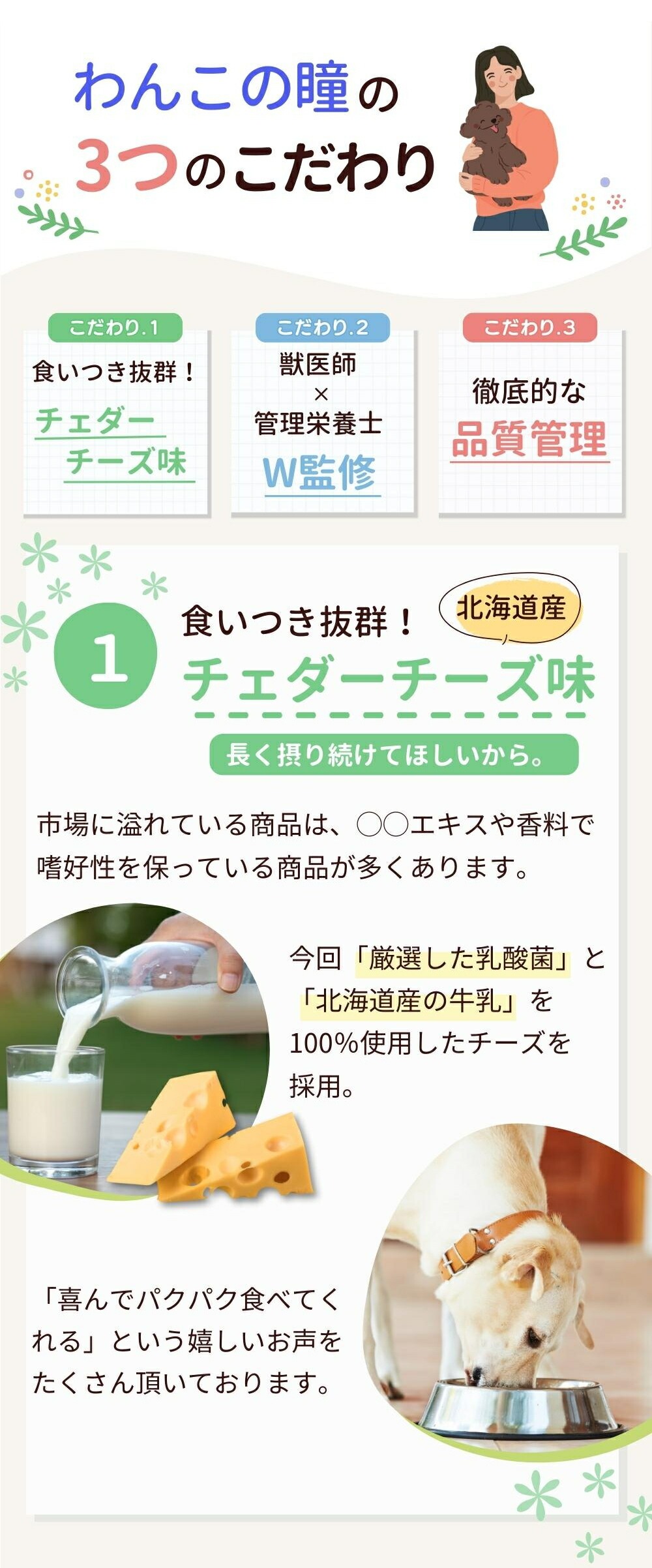 大切なパートナーのストレスにならないように北海道産チェダーチーズ味を採用し、アントシアニン量はブルーベリーの6倍のビルベリーを使用しており安全性・国内製造にこだわりました。