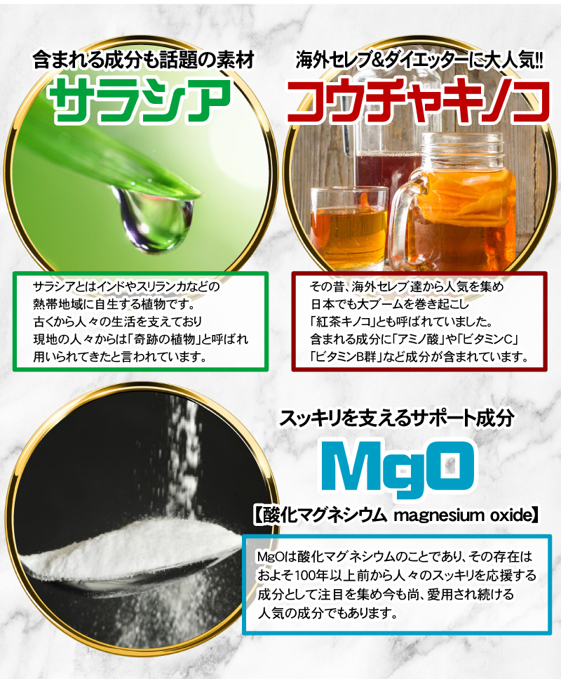 | 原材料名 | 難消化デキストリン(国内製造)、白インゲン豆抽出物、サラシア末、デキストリン、キノコキトサン、杜仲茶、ウチワサボテン末、桑の実末、発酵紅茶エキス / 酸化マグネシウム、結晶セルロース、ショ糖脂肪酸エステル、微粒二酸化ケイ素、ステアリン酸カルシウム、ビタミンB6、ビタミンB1、香辛料抽出物 |