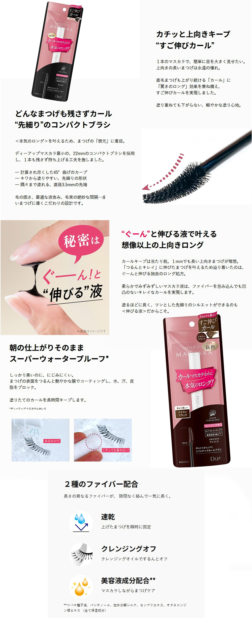 ◇カールマスカラなのに、本気のロング! ◆ただのカールマスカラではなく、自まつげを極限まで長く見せることにこだわったマスカラです。 ◇カチッと上向きキープ“すご伸びカール”。 ◆直毛まつげも上がり続ける「カール」に、「驚きのロング」効果を兼ね備え、すご伸びカールを実現しました。 ◇塗り重ねても下がらない、軽やかな塗り心地。 ◆どんなまつげも残さずカール “先細り”のコンパクトブラシ。 ◇ディーアップマスカラ最小の、22mmのコンパクトブラシを採用し、1本も残さず持ち上げる工夫を施しました。 ◆計算され尽くした45度曲げのカーブ、キワからぬりやすい先細りの形状、隅々まで塗れる直径3.5mmの先端。 ◇毛の固さ、最適な液含み、毛束の絶妙な感覚、全てダマのない美しいまつげに導くこだわりの設計です。 ※季節により、寒い時期などは中身が固まる可能性がございます。 なるべく温かい場所で保管いただき、繊維の偏りを感じましたらドライヤーで軽く温めたり、 湯煎などをお試しいただきますようお願いいたします。 |