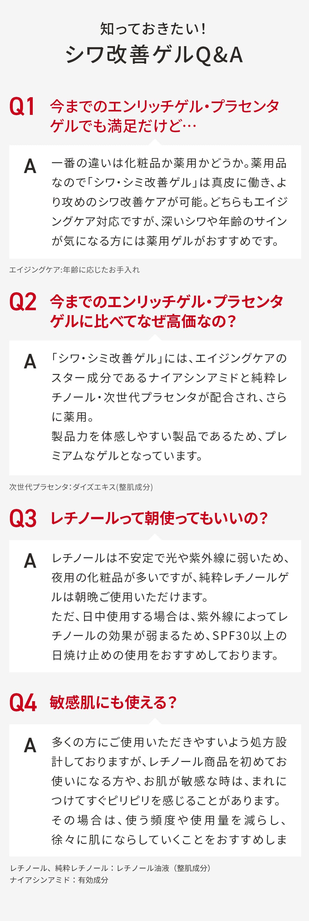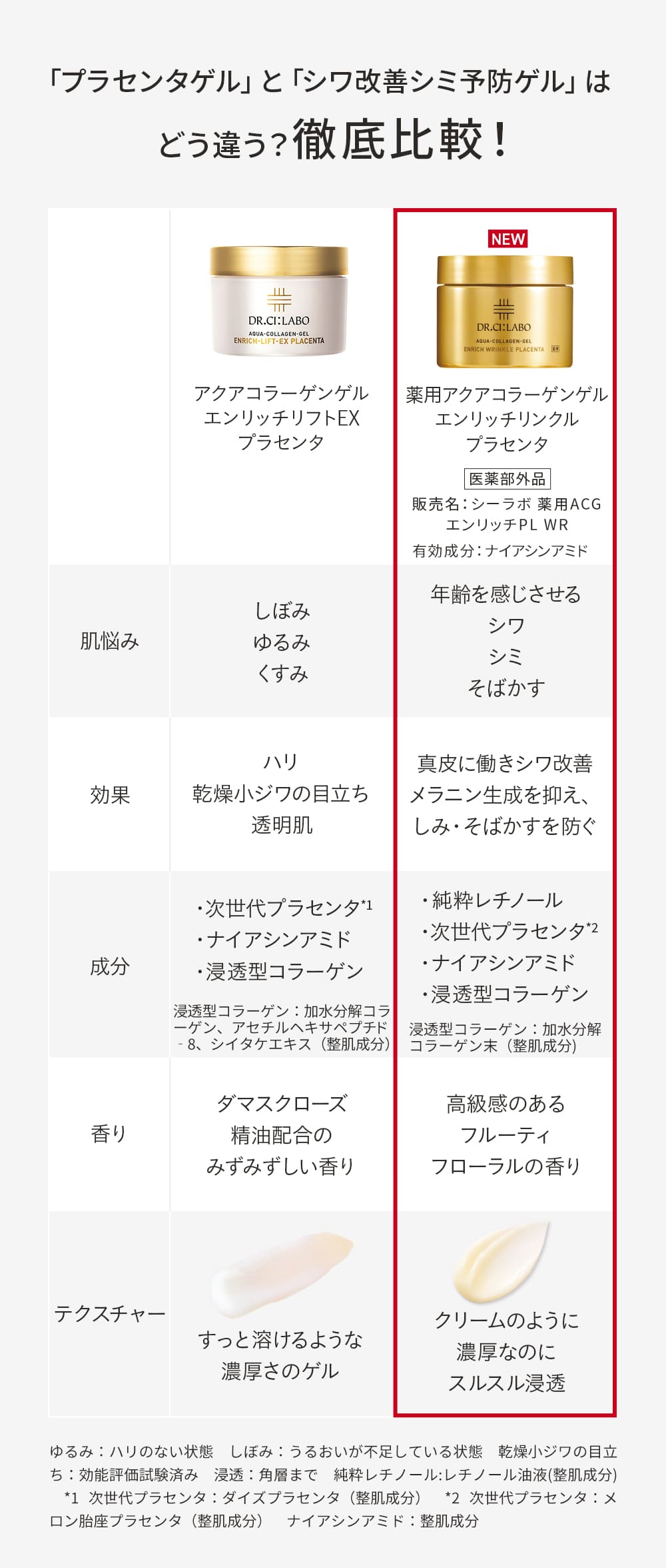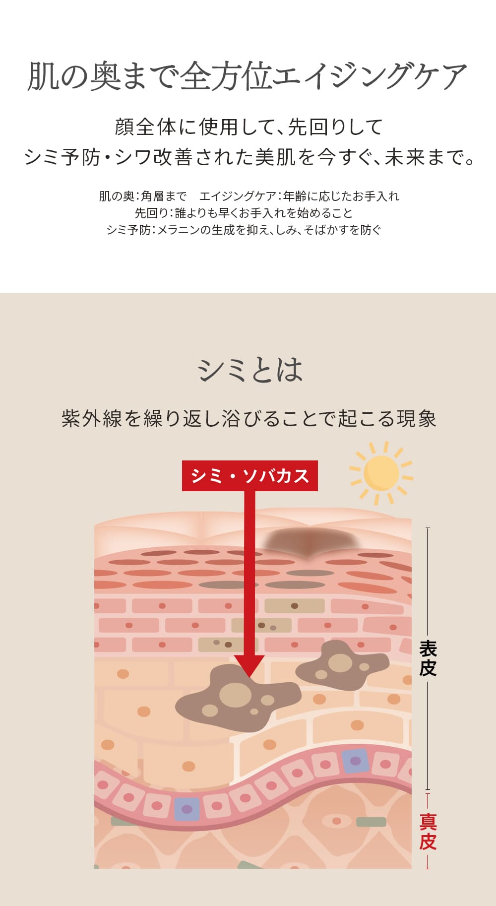 ナイアシンアミド*、水、濃グリセリン、ジグリセリン、ペンチレングリコール、ダイズエキス、植物性スクワラン、オリブ油、レチノール油液、加水分解コラーゲン末、ヒアルロン酸Na-2、アセチル化ヒアルロン酸ナトリウム、天然ビタミンE、ホホバ油、メドウフォーム油、N−ラウロイル−L−グルタミン酸ジ(フィトステリル・2−オクチルドデシル)、油溶性カロットエキス、グリセリン、モノオレイン酸ポリオキシエチレンソルビタン(20E.O.)、アラキルグルコシド・アラキルアルコール・ベヘニルアルコール、カルボキシビニルポリマー、アクリル酸・メタクリル酸アルキル共重合体、BG、DPG、PVP、水酸化K、トリメチルグリシン、エデト酸塩、フェノキシエタノール、香料