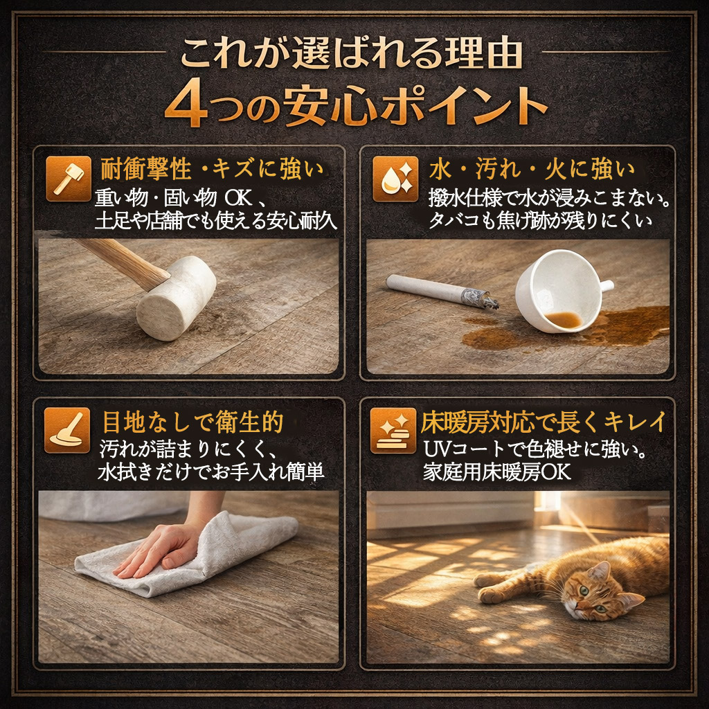 はめ込み式クリック構造 / 簡単施工 / DIY施工可能 / 耐水性PVC素材 / 床暖房対応 / リアルな木目デザイン / 床リフォームにおすすめ / 畳の上から敷ける