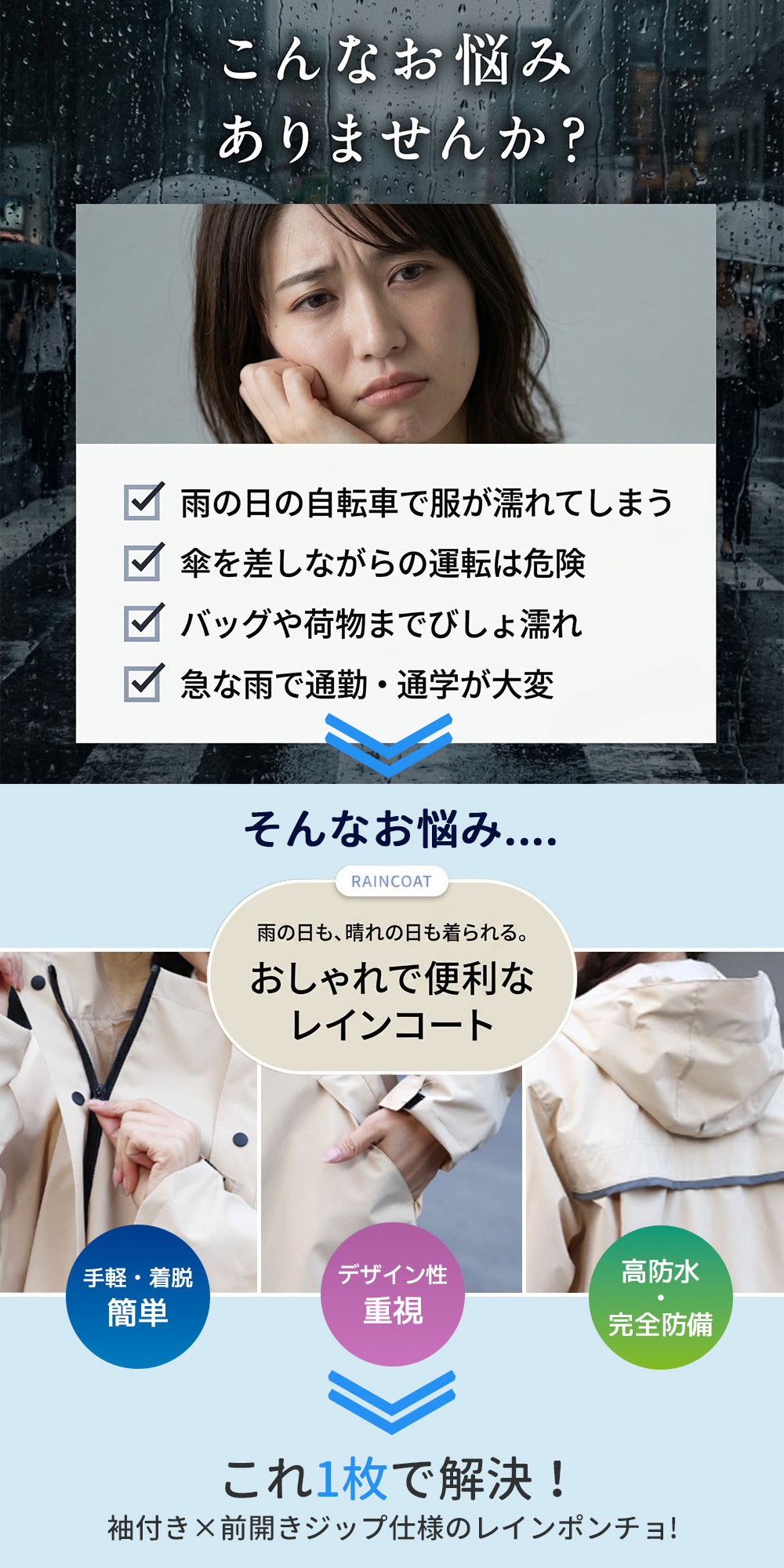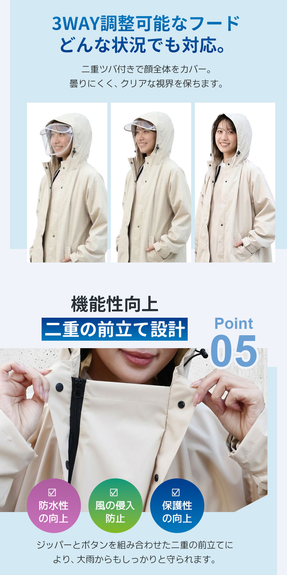 | 【多機能3in1レインコート】 | 雨の日はレインコートとして、曇りの日はアウターとして、そして猛暑日にはUVカットウェアとして活躍! 一枚でさまざまな天候に対応できる便利なデザイン。 |