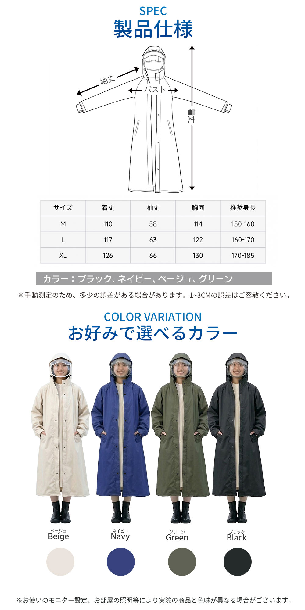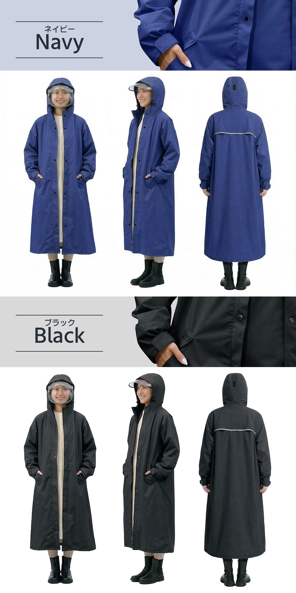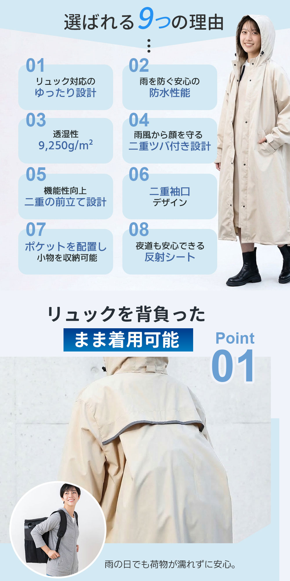 | 【リュックの上から着用OK】 | リュックを背負ったままでもすっぽりカバーできる余裕のあるシルエット。 通勤・通学やお買い物の際も荷物が濡れずに安心! |