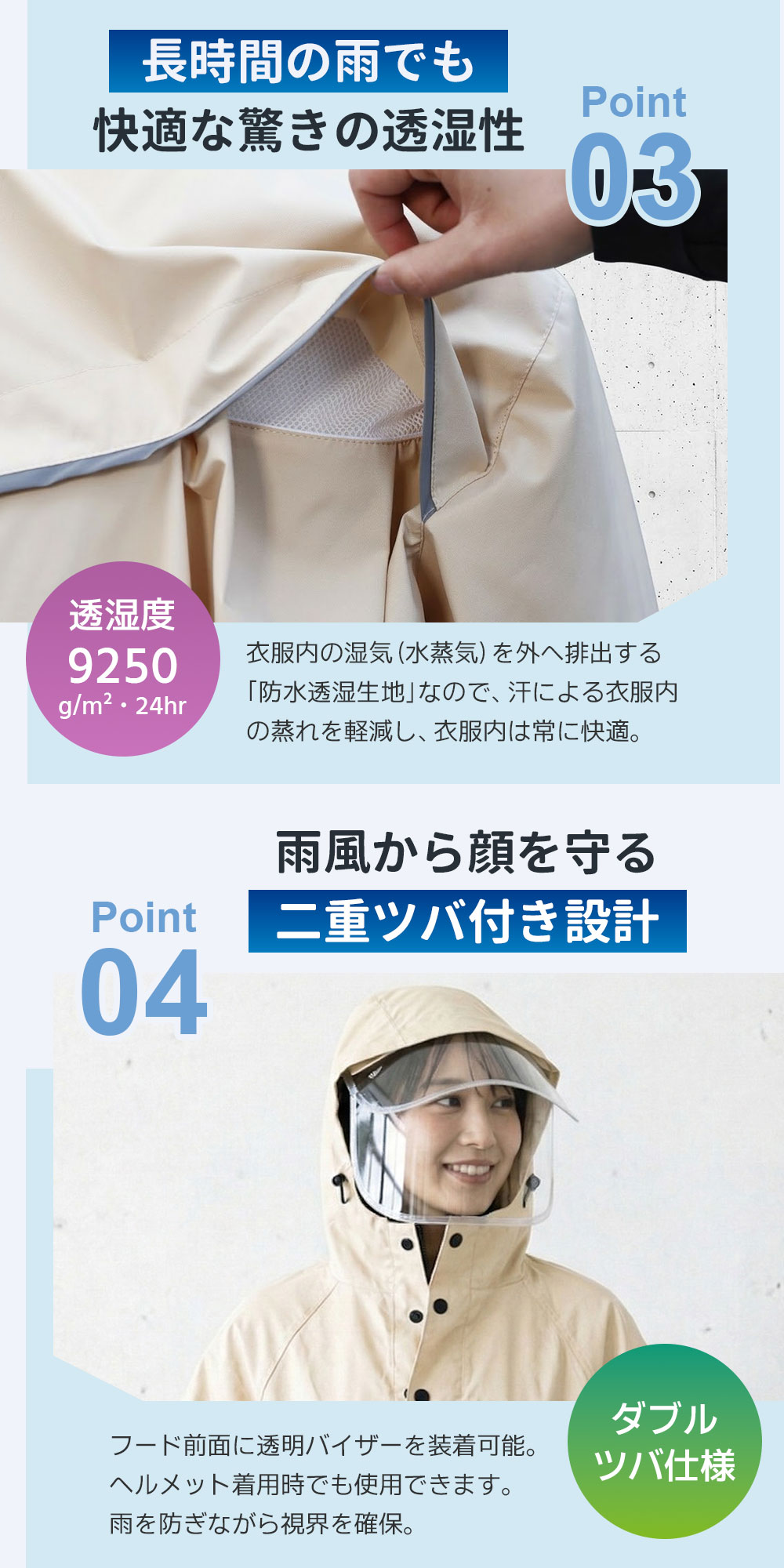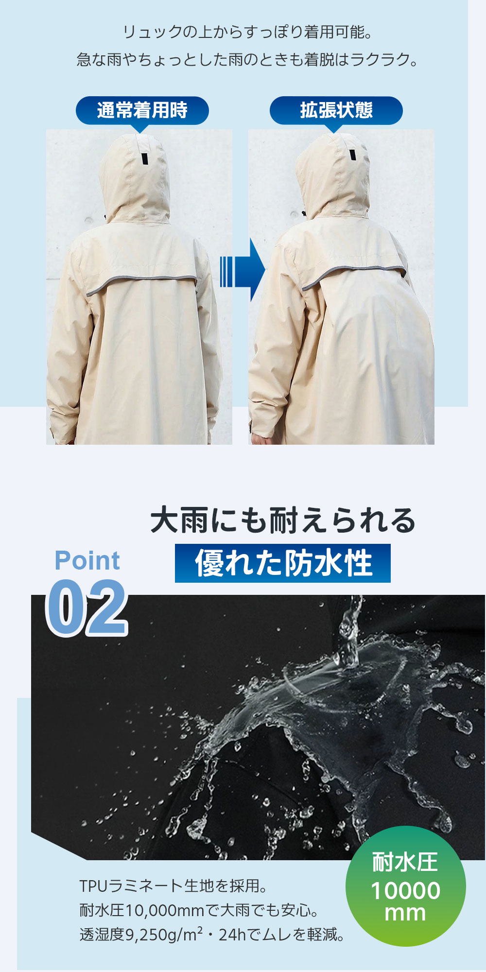 | 【抜群の防水性&通気性】 | 耐水圧10,000mmの高性能防水素材を採用し、大雨でもしっかりと水を防ぎます。 |