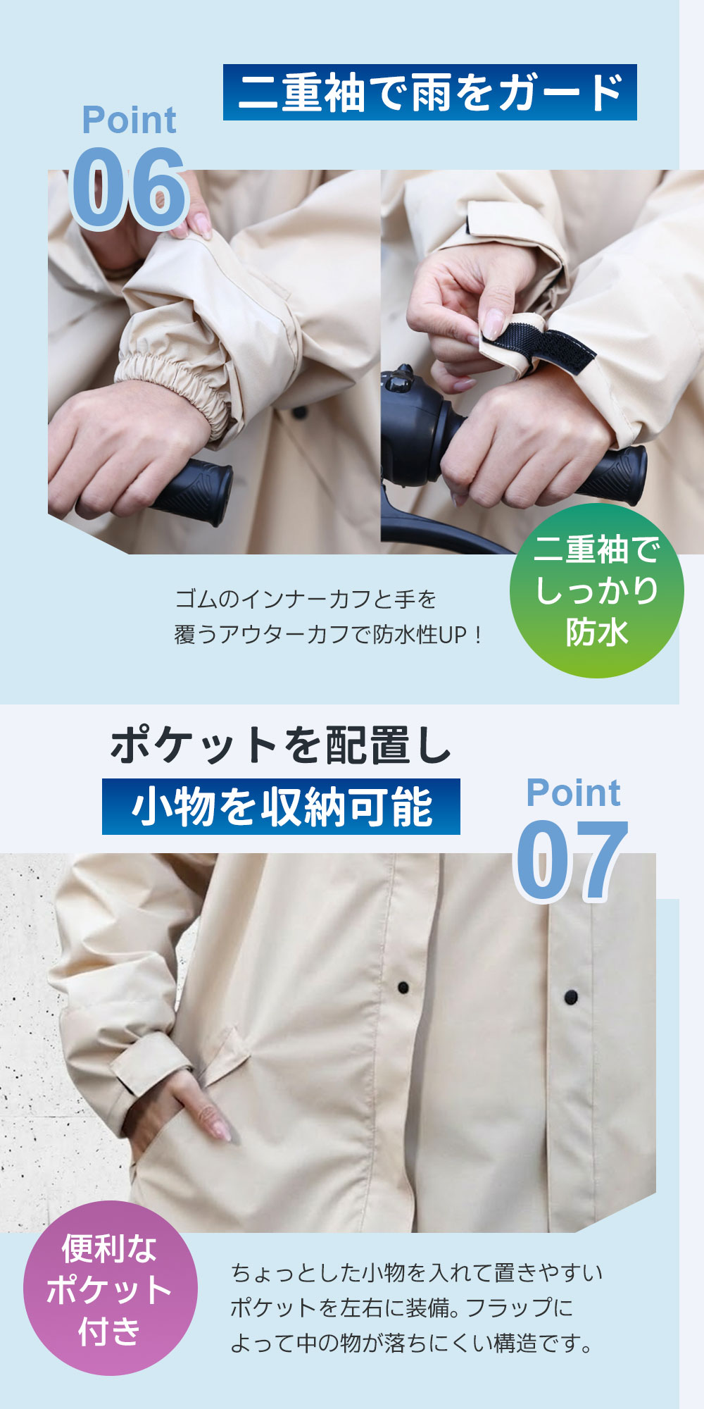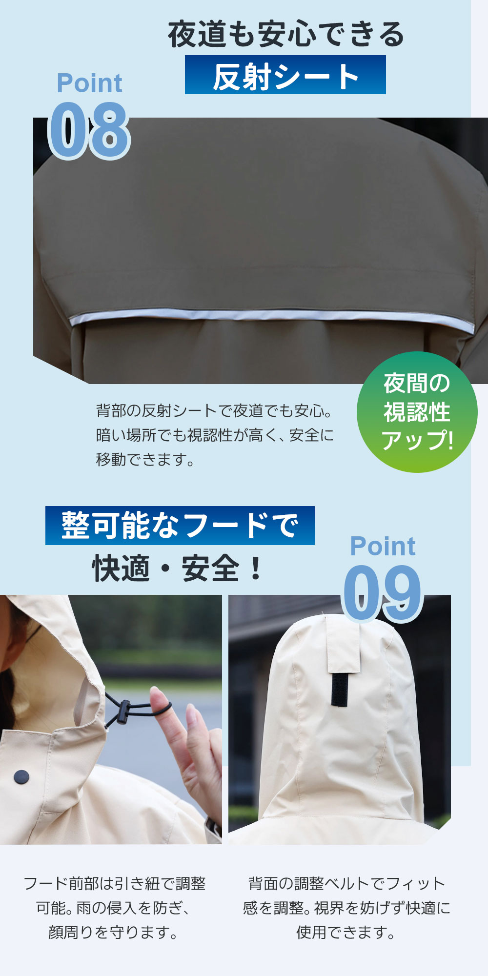 | 【安全性を考慮した設計】 | ・前立ては二重構造で風や雨の侵入をブロック ・袖口は二重設計で水の浸入を防ぎ、防水性アップ! ・背面には反射シート付きで、夜道の視認性を向上 |