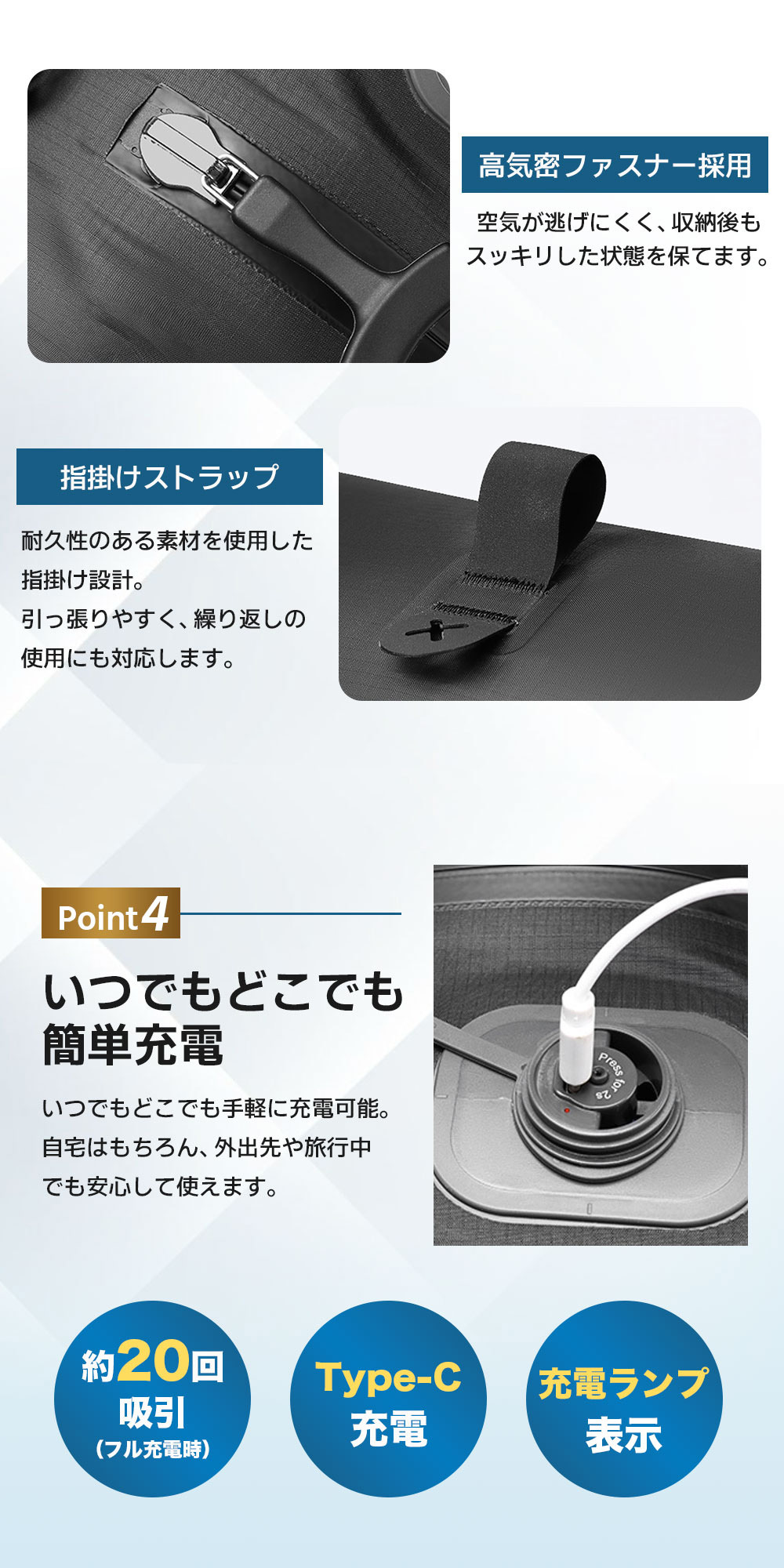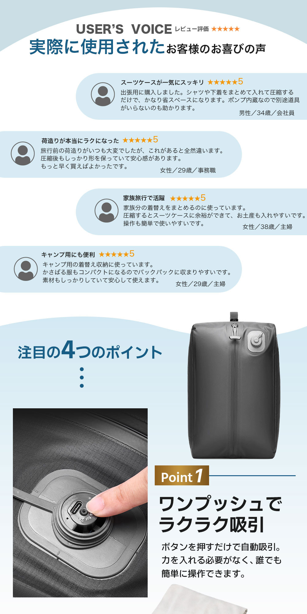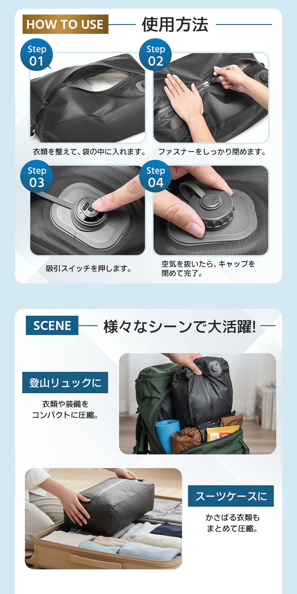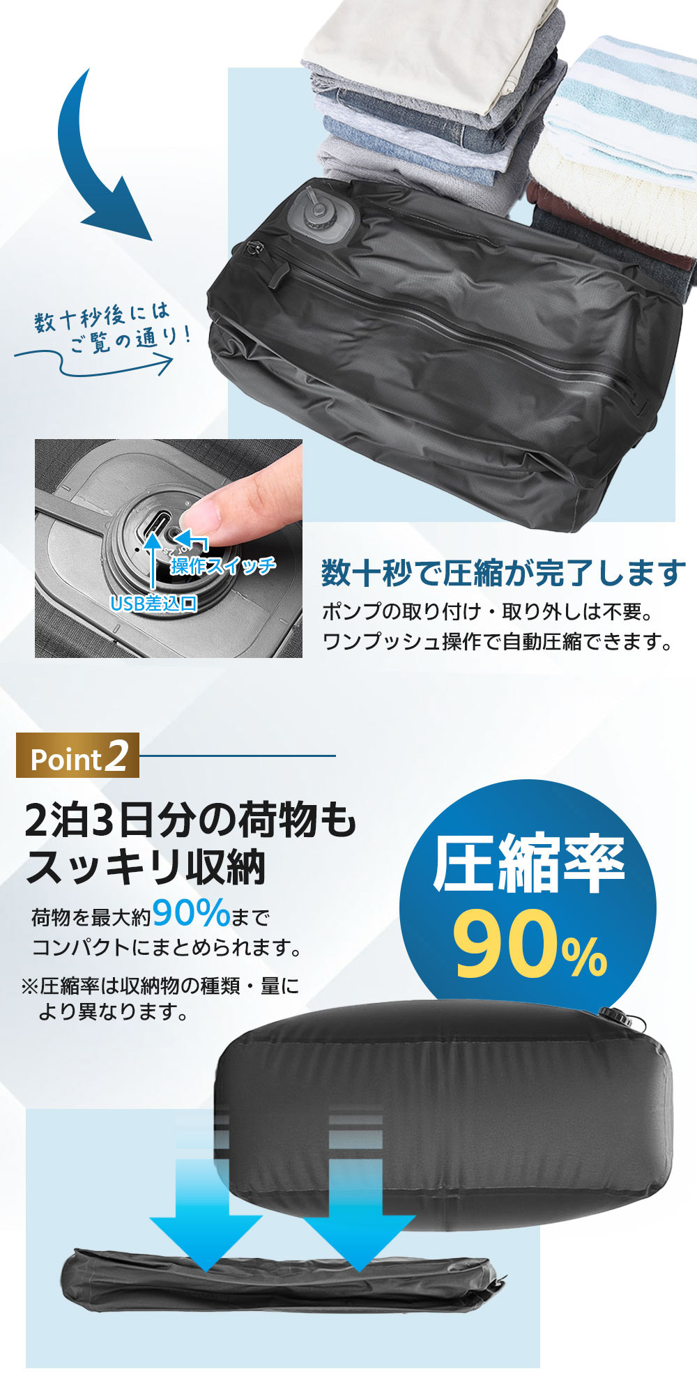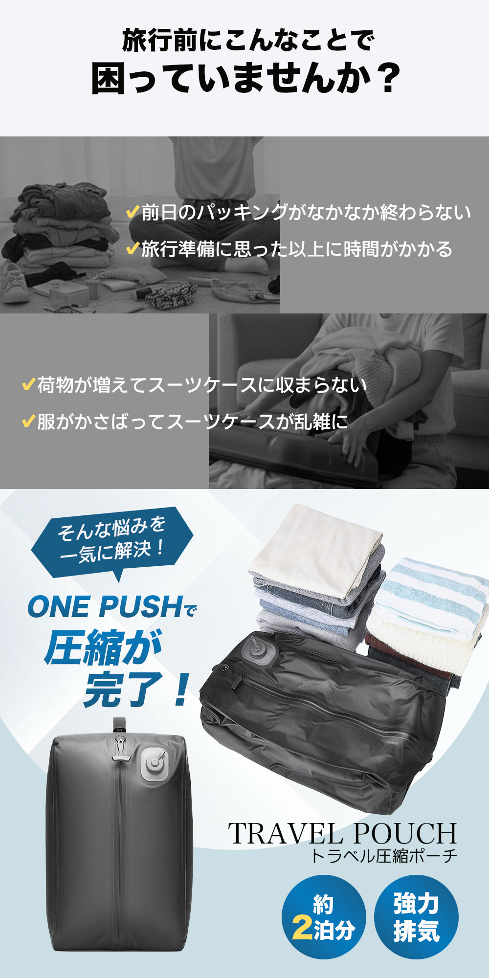 電動圧縮トラベルポーチが、準備のストレスを一気に解消します。