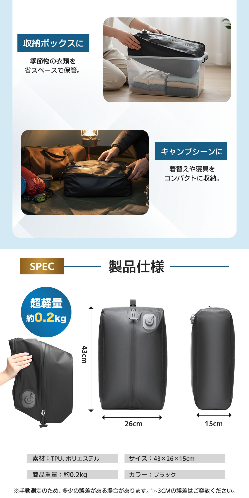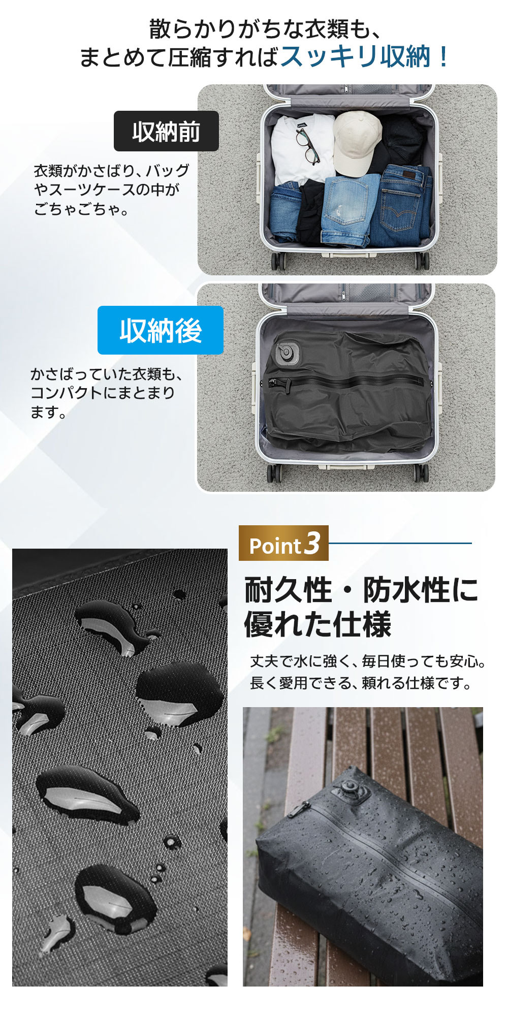 かさばりやすい衣類も、まとめてコンパクトに圧縮。