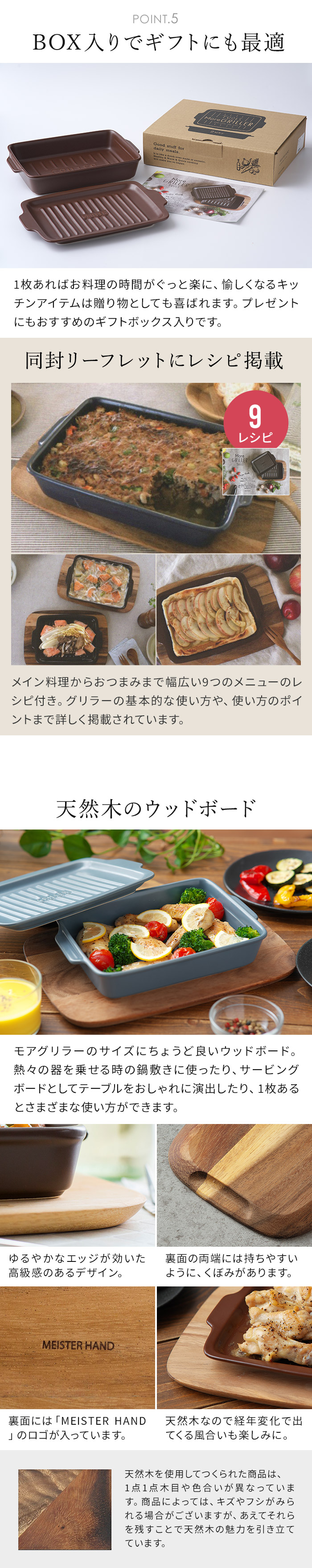 | 累計販売32万個をこえるベストセラー「GRILLERグリラー」をもっと便利に、もっと使いやすく開発された「More GRILLER モアグリラー」。ポイントは本体と蓋を別の用途で使えること。深さのある本体はグラタンなどに最適で蓋を外せばこんがり焦げ目も付けられます。蓋はグリルプレートのように単体で使用できます。下ごしらえから、調理、器になるオールインワンクッキングがかなう便利さです。薄型なのでコンロの魚焼きグリルに入れられます。他にも直火、オーブン、トースター、電子レンジと様々な熱源で使えます。北欧ブルーは当店限定カラー。 | |
