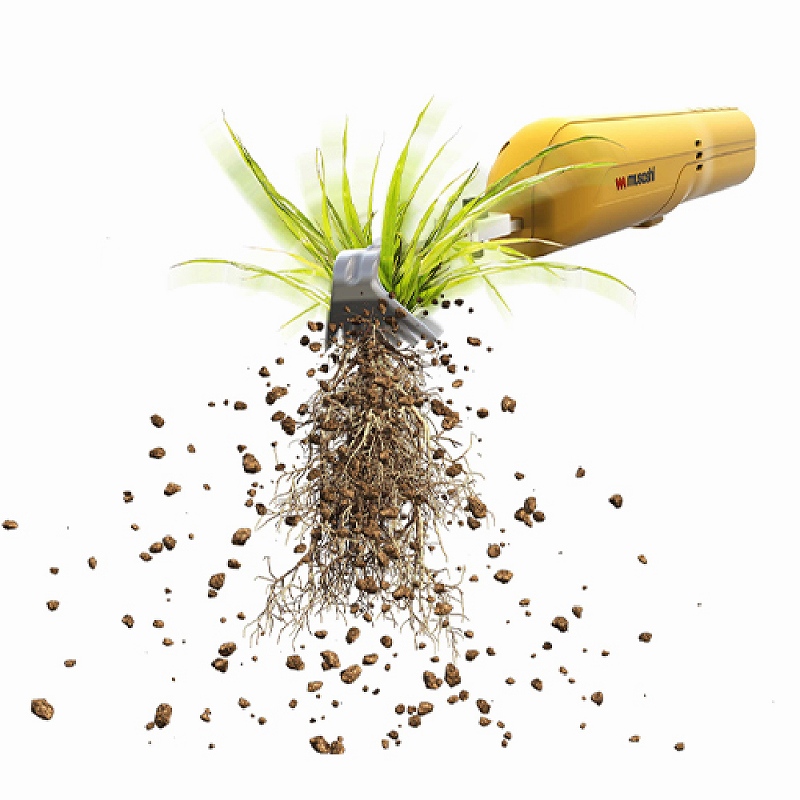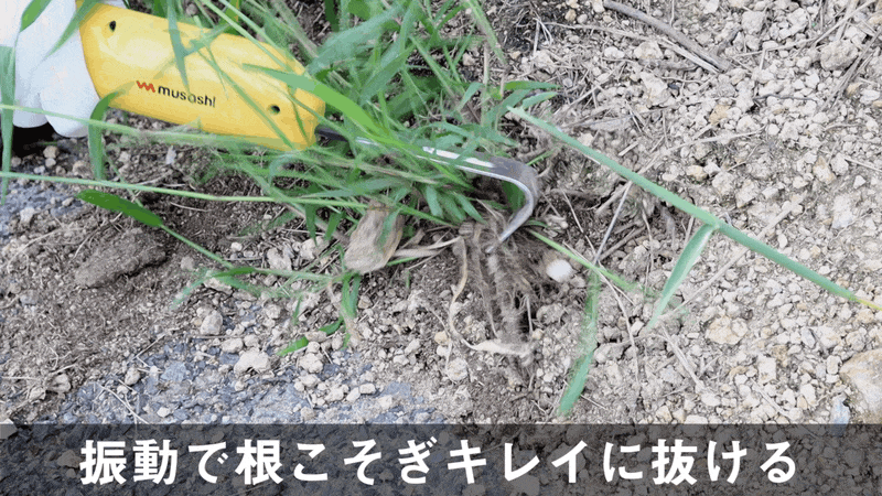 この除草バイブレーターは高炭素鋼ブレードが振動することで土をほぐし、雑草の根元をしっかり捉えて根こそぎ抜き取ります。