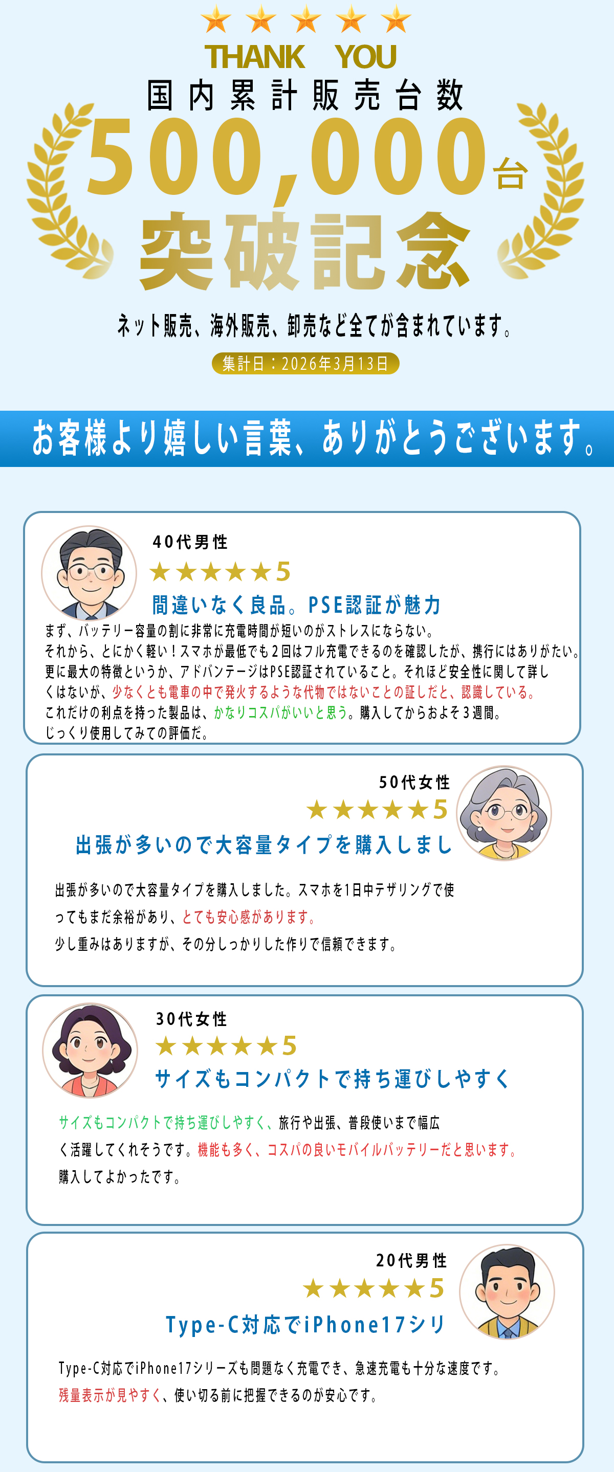 日本の電気用品安全法お技術基準に合格した安全性の高いモバイルバッテリーです。軽荷重保護、過電流保護、短絡保護、過充電保護、過熱保護、低電圧保護等の6つ安心の回路設計を備えました。