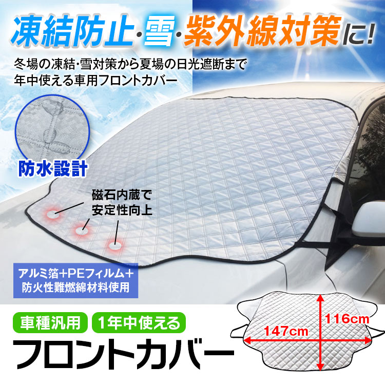 - 冬場の凍結・雪対策から夏場の日光遮断まで、年中使える車用フロントカバーです。良質な生地を使用し防水性もあるので、雪、雨、霧、氷、埃、直射日光、紫外線などからマイカーを守ります。