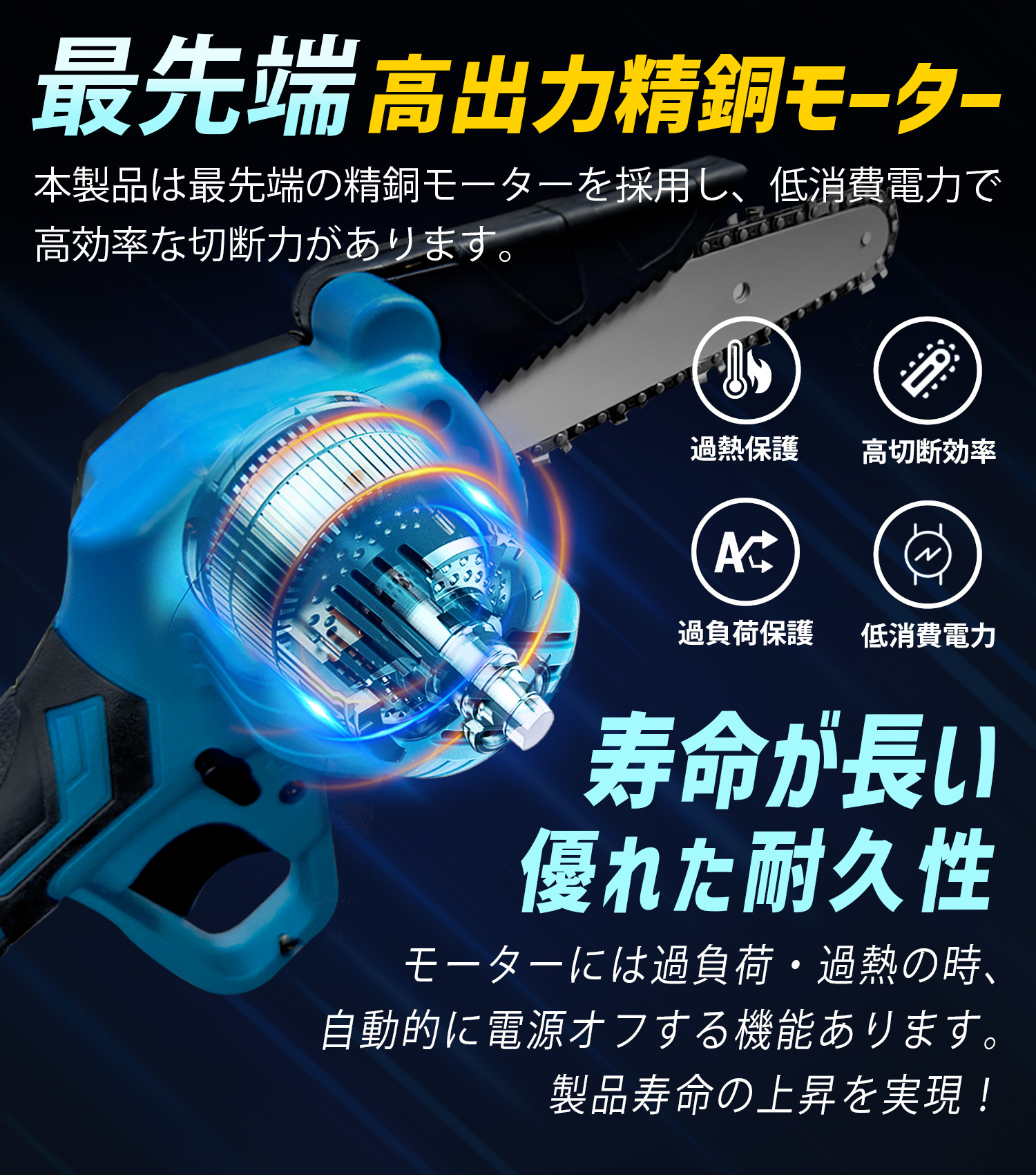 充電式チェーンソーは、強力な純銅製のモーターを搭載し、強力な高速回転、最大30cmの切断直径、従来の製品に比べて切断効率が飛躍的に向上しました。 高品質のチェンブレード(耐久性とスムーズな切断のために焼入れ処理されたブレード)、高硬度、良好な耐摩耗性を使用して、チェーンが損傷することは容易ではありません。